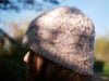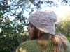 morceaux. Le premier forme un bandeau. Puis de chaque côté de celui-ci, on relève des mailles pour créer d’une part le corps du bonnet en torsades et d’autre part le bord côtes doublé sur lui-même.
