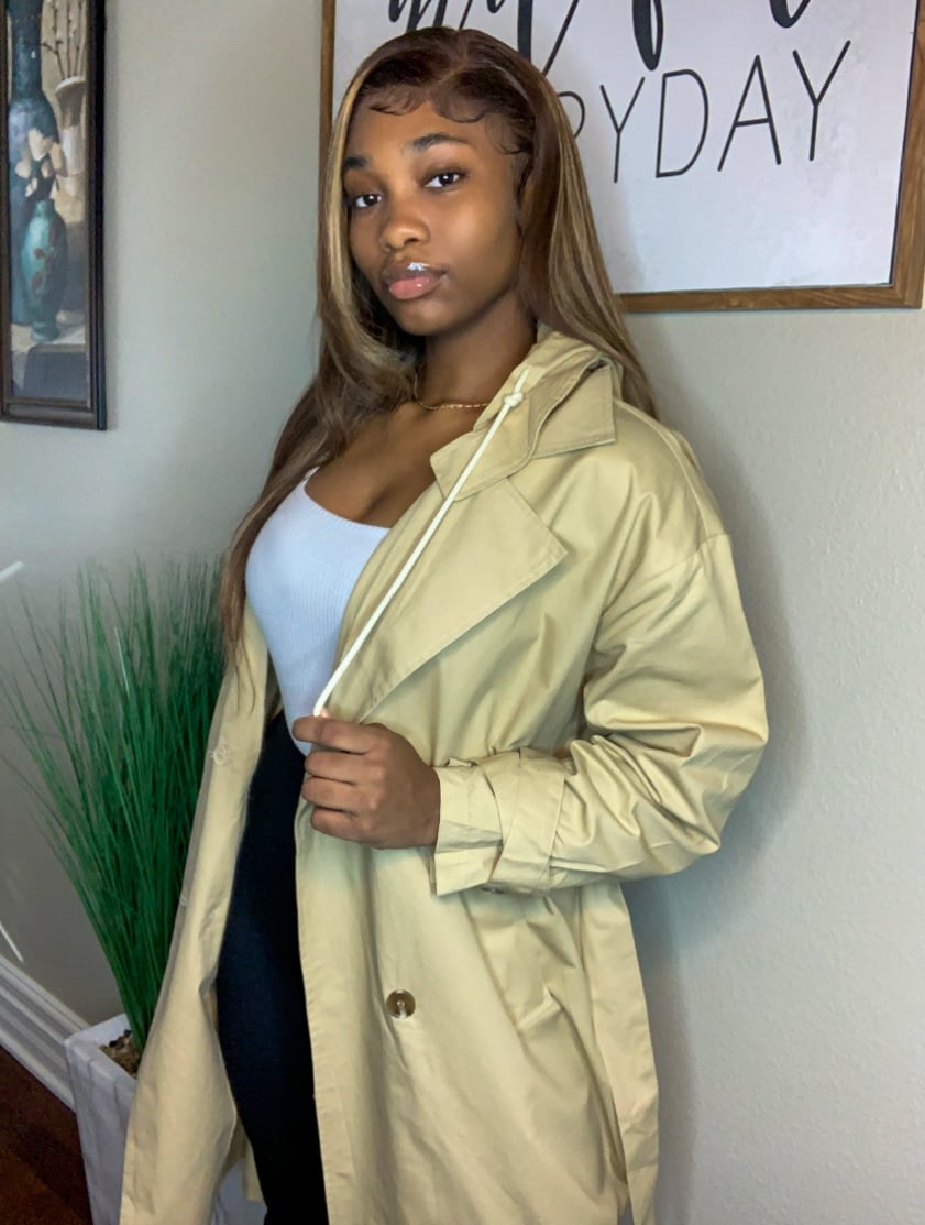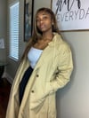 This classic ever-popular trench coat features a double breasted button front, tie waist, two side entry pickets, long sleeves with tie details at cuffs.