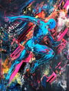 A high-impact explosion of color, movement, and raw ambition, this artwork captures the essence of unstoppable drive and resilience. The electric blue figure surges forward, breaking through an abstract chaos of neon streaks, textured brushstrokes, and high-energy splashes of fiery reds, bold yellows, and deep blacks—symbolizing the intensity of passion, struggle, and triumph.