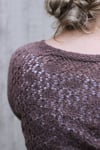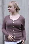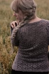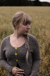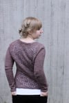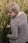 Uan is a woolly cardigan worked seamlessly top-down. It’s got full-length set-in sleeves. The cardigan is mostly stockinette stitch but the back has a beautiful lace panel and the trims are worked in seed stitch.