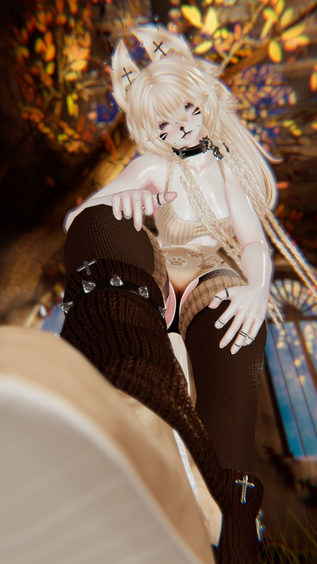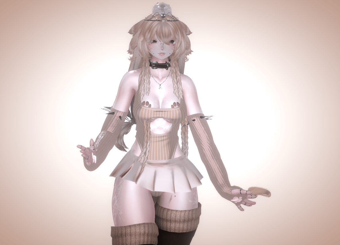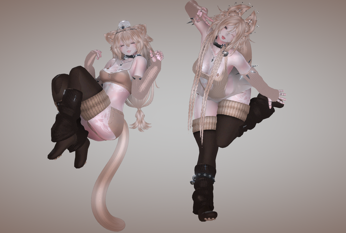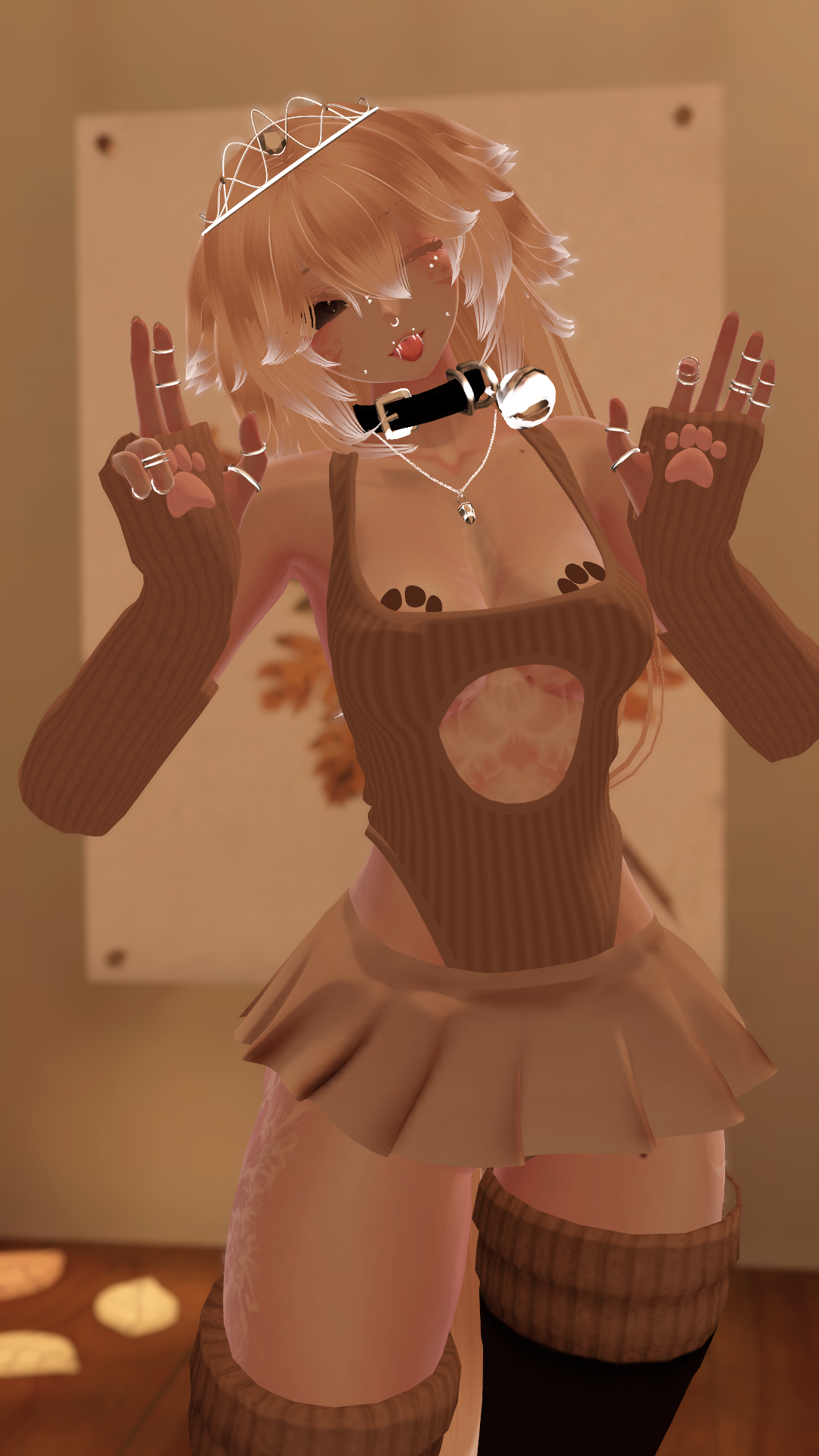 Accs: Piercings , Boots, ears 1 + tail, chubby kitty, Collar, arm warmers, socks, necklace, Tear Glasses, mouth kitty, ears 2 (long), Tiara, rings, leg warmers, worm toy