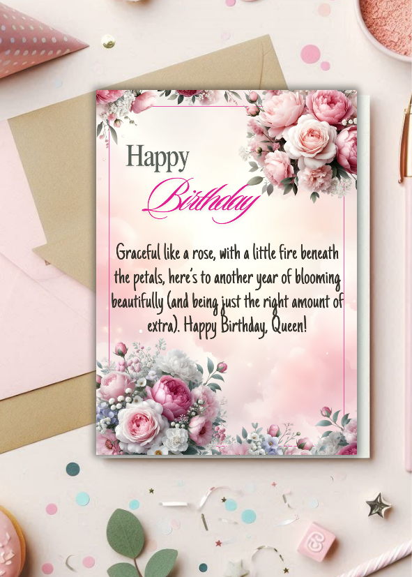 Celebrate her special day with elegance and flair! This printable birthday card features a stunning pink floral design with lush peonies and roses, paired with a sweet and sassy message that’s perfect for queens who deserve the world.