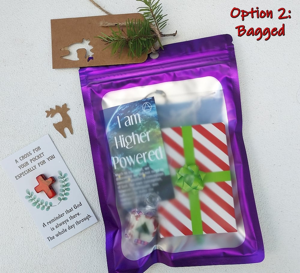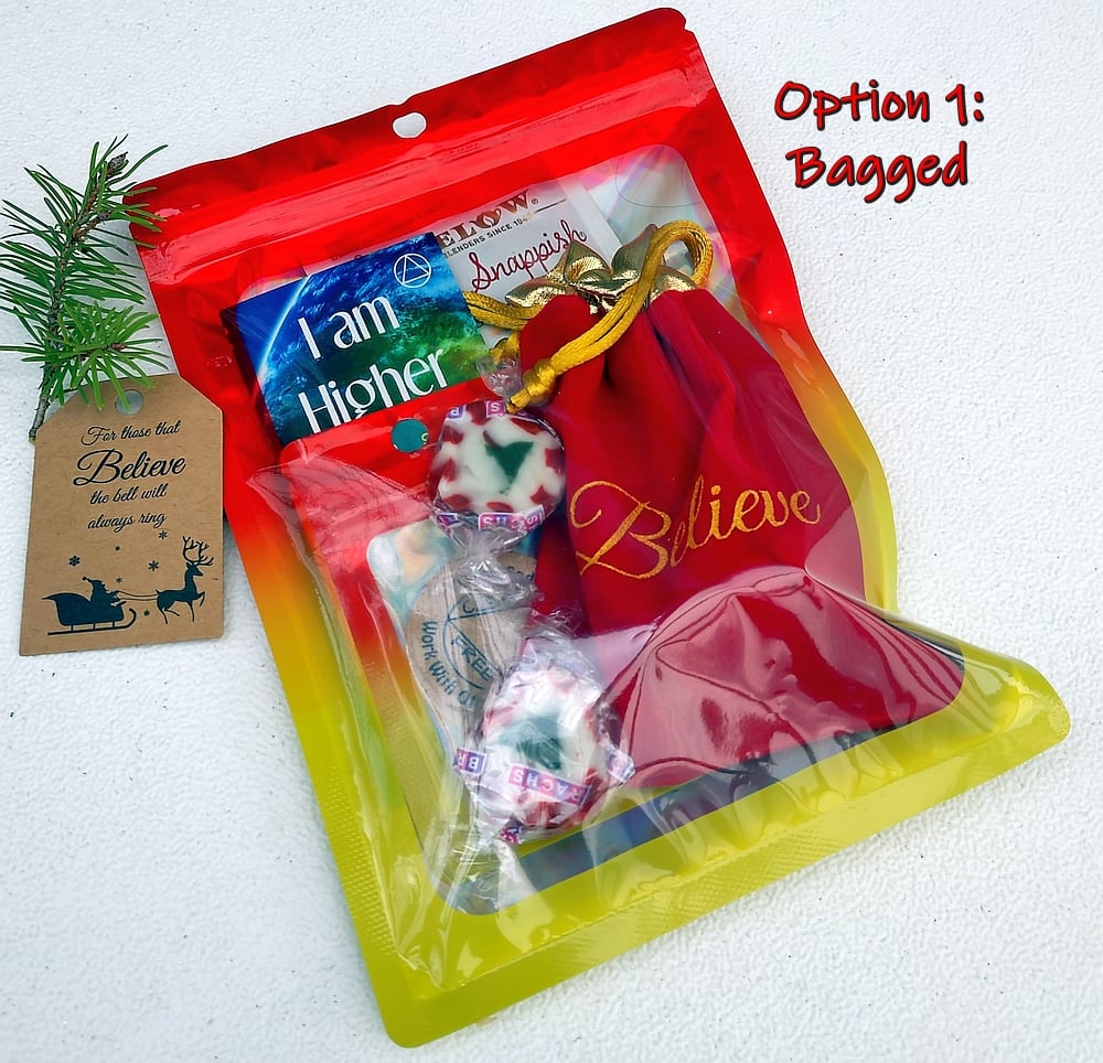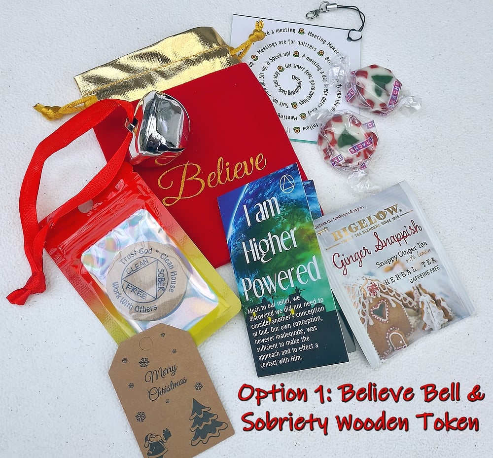 Option 1: Believe Bell in Velveteen Token Saver Bag with Tag * Digital download of the Pocket Sponsor * Sobriety Wooden Token * 2 Brach's Xmas taffy * Higher Powered Concept Card * Holiday Tea * Virtual Meeting Finder Card on small Lanyard. (the velveteen bag is also a keepsake token's saver bag)