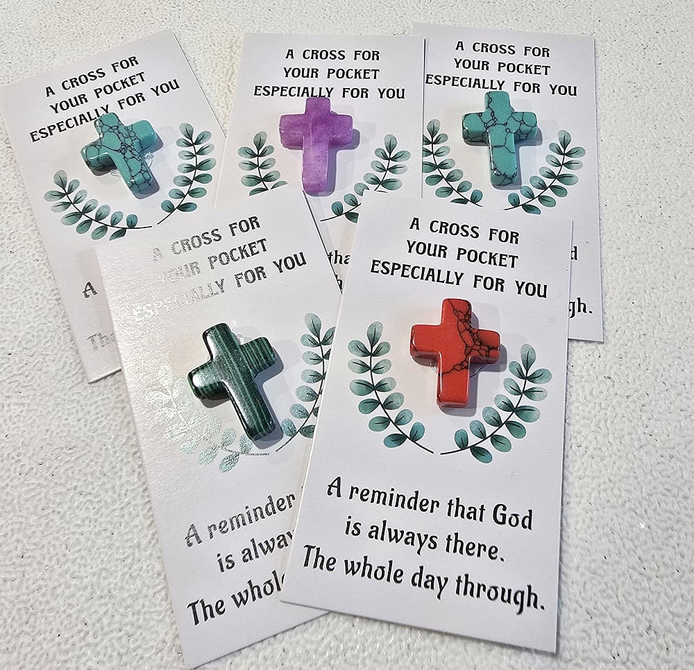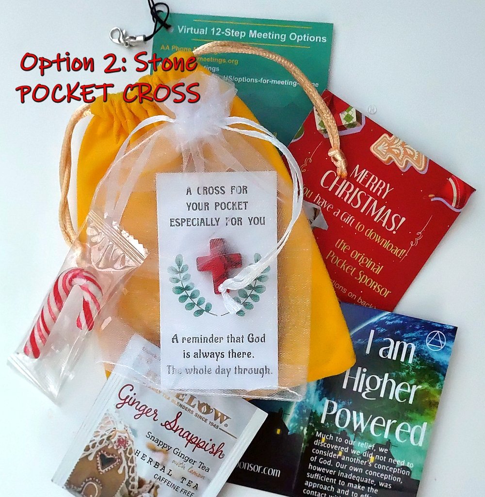 Option 2: Gemstone-Style Stone Pocket Cross in white organza bag * Digital download of the Pocket Sponsor * 1 Mini Candy Cane + Taffy * Higher Powered Concept Card * Holiday Tea * Virtual Meeting Finder Card on Lanyard. (the Pocket Cross in the organza bag will be placed either in a mustard yellow velveteen bag--to be used as a token keepsake saver bag--or small Christmas box)