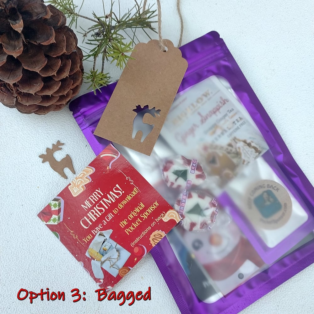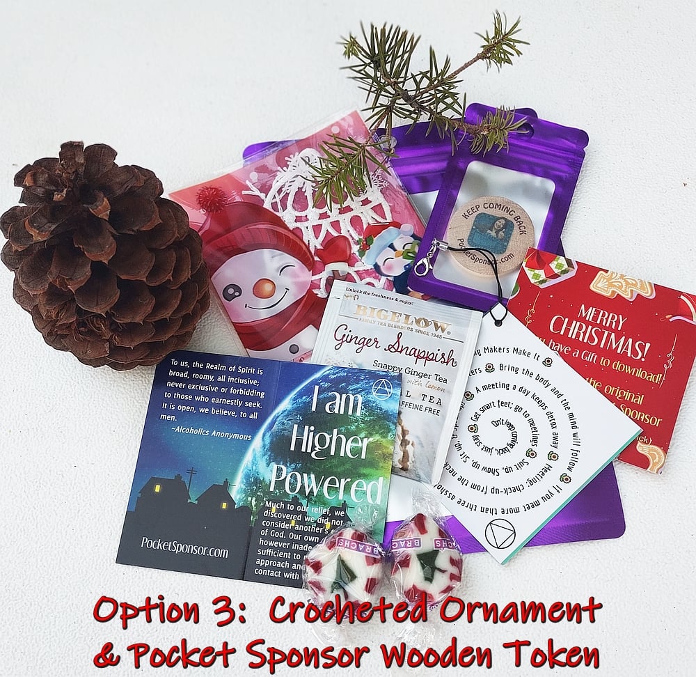Option 3: Crocheted Ornament * Digital download of the Pocket Sponsor * 2 Brach's Xmas taffy * Pocket Sponsor Wooden Token * Higher Powered Concept Card * Holiday Tea * Virtual Meeting Finder Card on Lanyard.