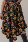 Exhibit your femininity in this beautiful, patterned skirt with an asymmetrical ruffled hem. The waist features a comfortable elastic band to allow for easy on and off. The decorative buttons provide a stylish finishing touch. Complete this glamorous ensemble with a tank top and boots.