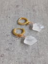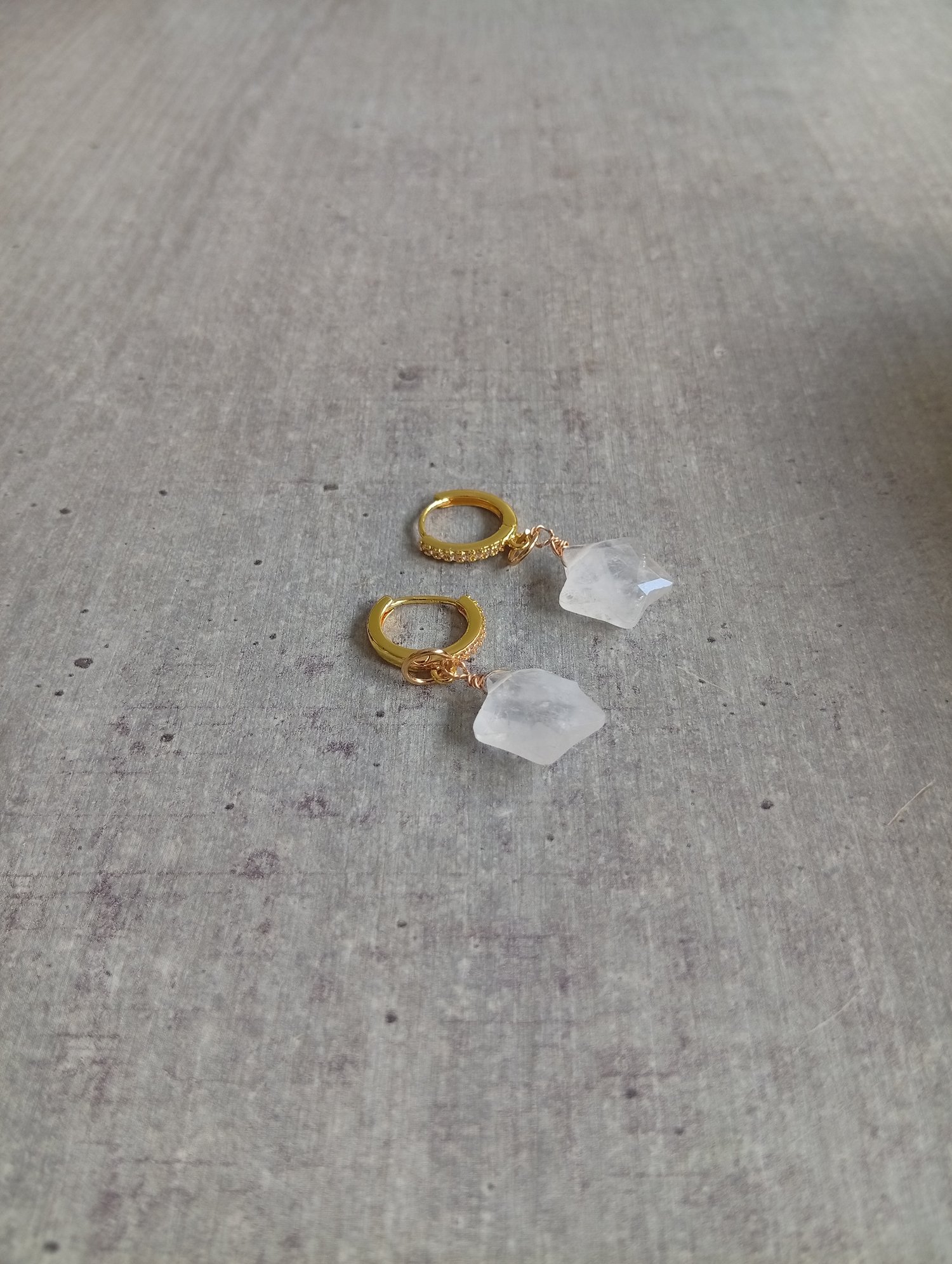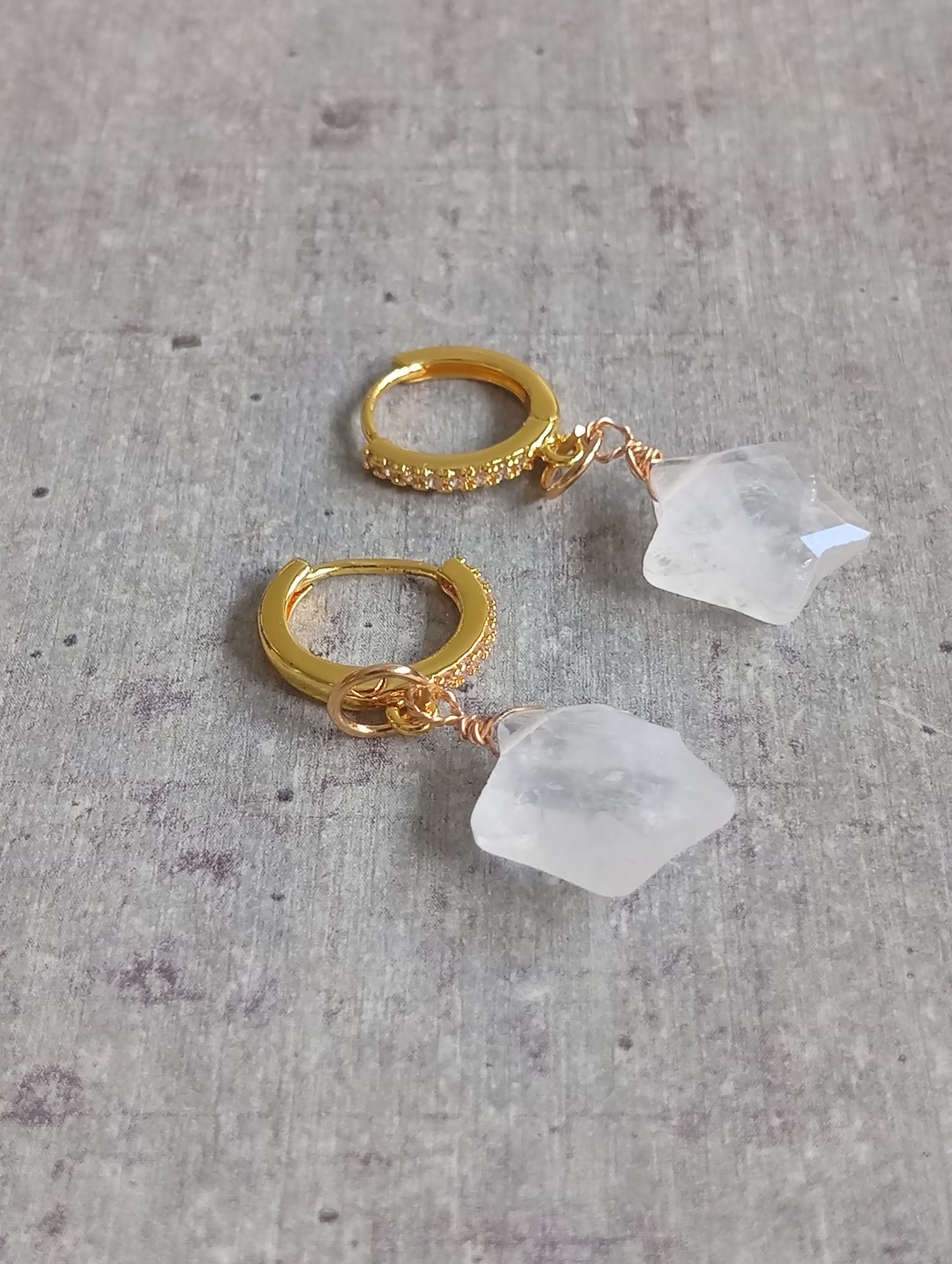 Boucles d’oreilles en cristal de roche, montées sur attaches dorées. Une création lumineuse et intemporelle, pensée pour purifier les énergies, élever l’esprit et apporter clarté et équilibre au quotidien.
