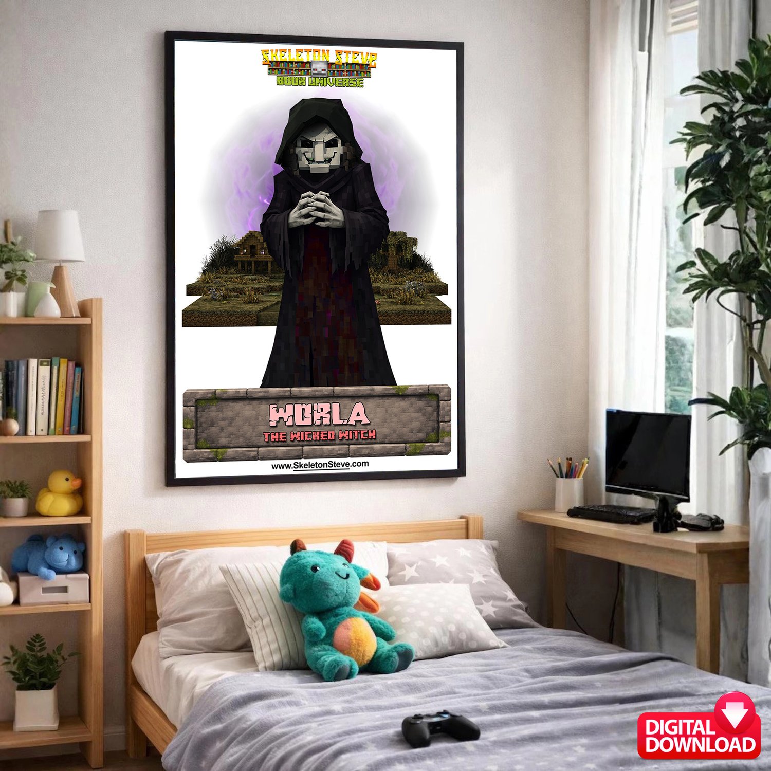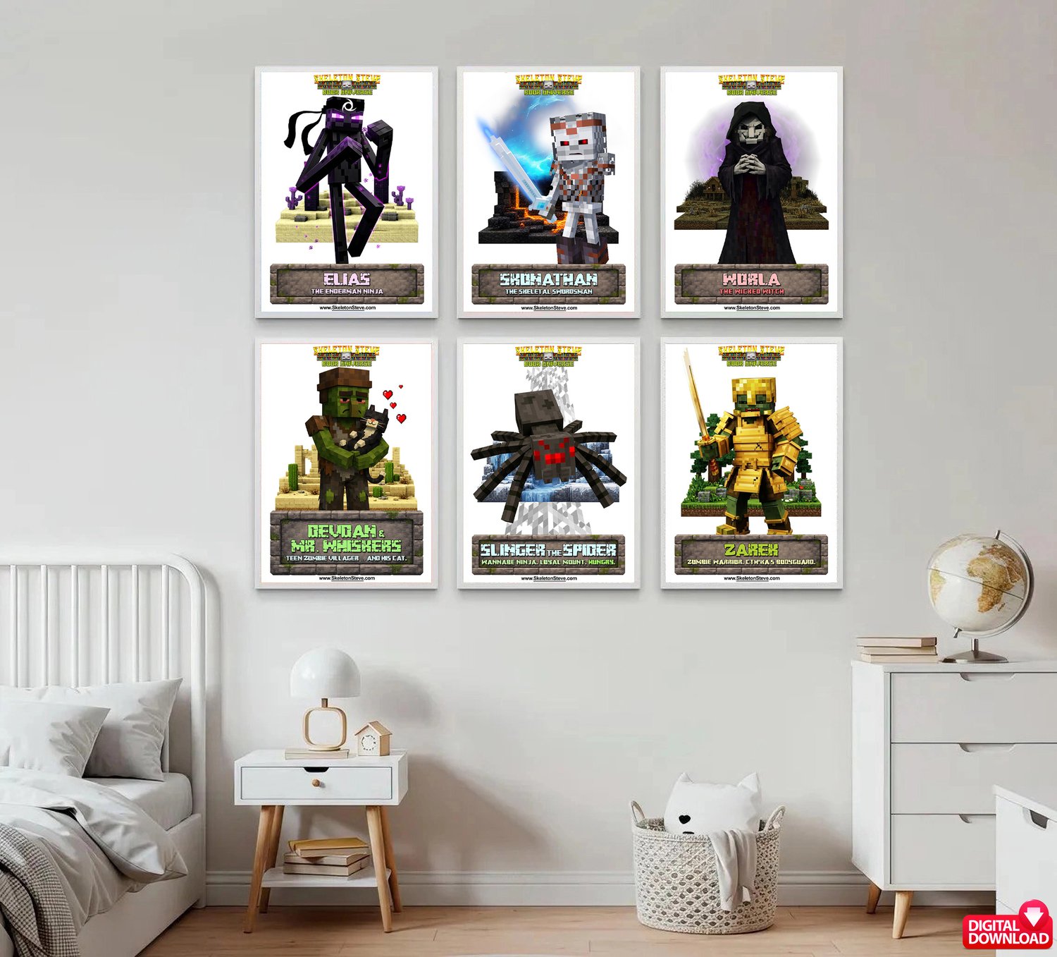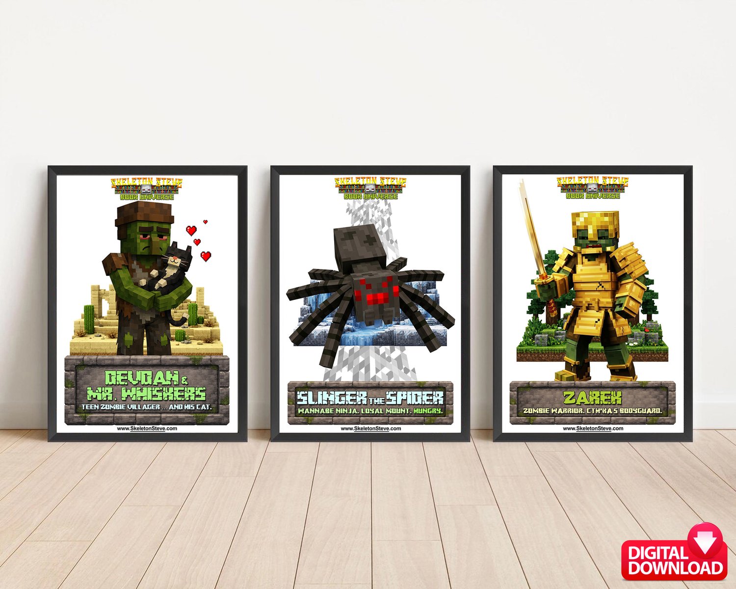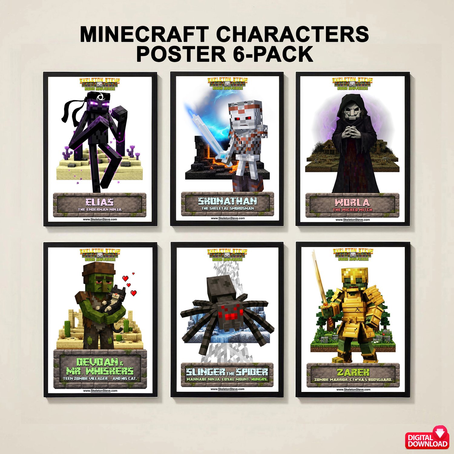 Decorate your gamer room with this Minecraft character poster set featuring heroes and villains from the Skeleton Steve adventure universe.
