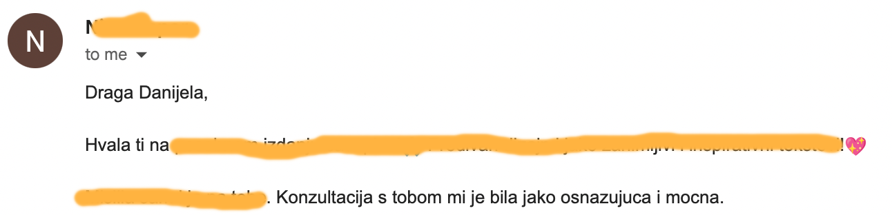 "Danas sam imala svoj prvi individualni mentorski poziv s Danijelom iz programa Biznis po kosmičkom dizajnu... i naprosto dobila krila. Danijela je vrlo precizna i temeljita te nadahnjuje potkrijepljenim informacijama iz natalne karte i koučinga. Sve mi je to trebalo, a vjerujem da bi u vremenima u kojima živimo svatko volio znati gdje je, kako je i što mu zvijezde i planete poručuju. E pa meni je sve to sročila Danijela – posebno informaciju da sam proteklih 16 godina bila pod utjecajem jedne planete, a sada, od 25. veljače, kreće mi aktivacija Saturna, što me izuzetno oduševilo. Jedva čekam vidjeti što sve donosi u moj život, a ja osjećam spremnost.