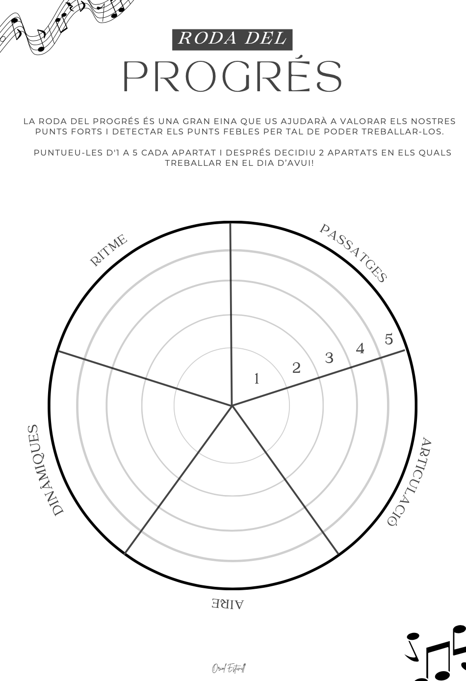 La roda del progrés és una gran eina que us ajudarà a valorar els vostres punts forts i a detectar els punts febles a l'hora de treballar una obra, un estudi, una obra per a banda, etc.