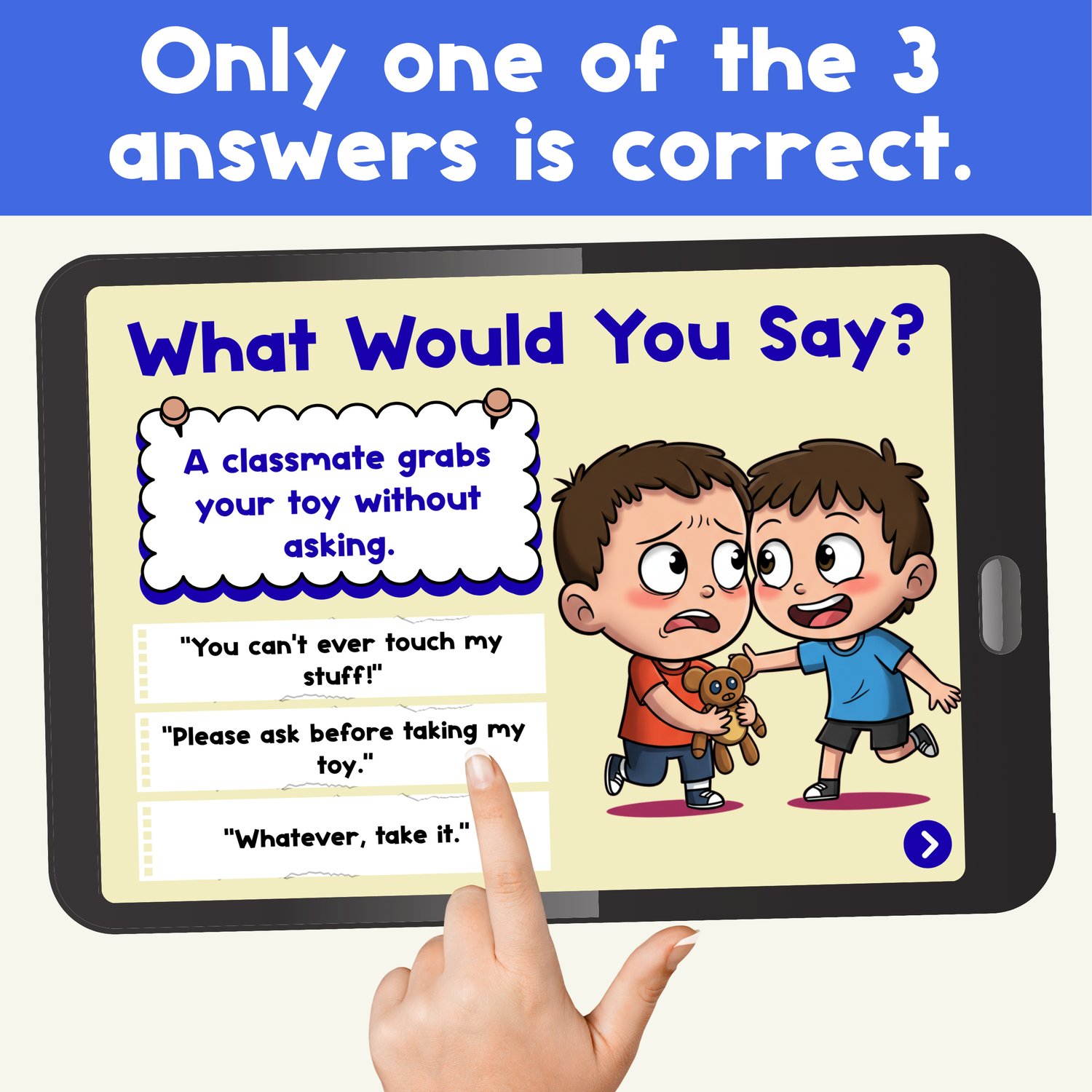Students will read short, realistic friendship scenarios and choose the best way to set or respect healthy boundaries. Perfect for SEL lessons, conflict resolution, and friendship building.