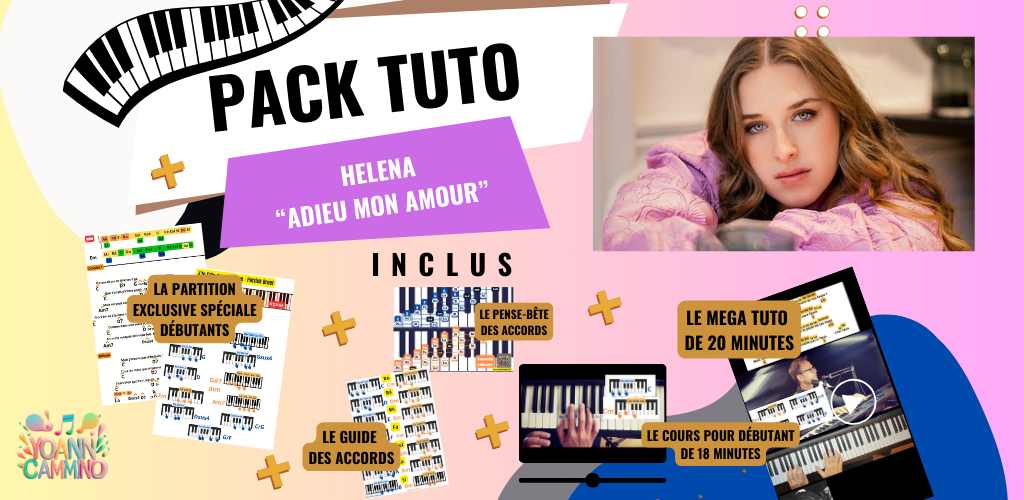 PACK TUTO : "Adieu mon amour" d'Helena : partition exclusive + vidéo du Tuto de 20 minutes + cours vidéo débutant + guide des accords + pense-bête des accords