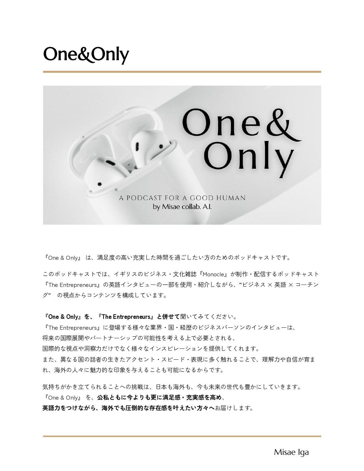 ポッドキャスト『One & Only』 は、満足度の高い充実した時間を過ごしたい方のための、海外の起業家のビジョンに触れるポッドキャストです。