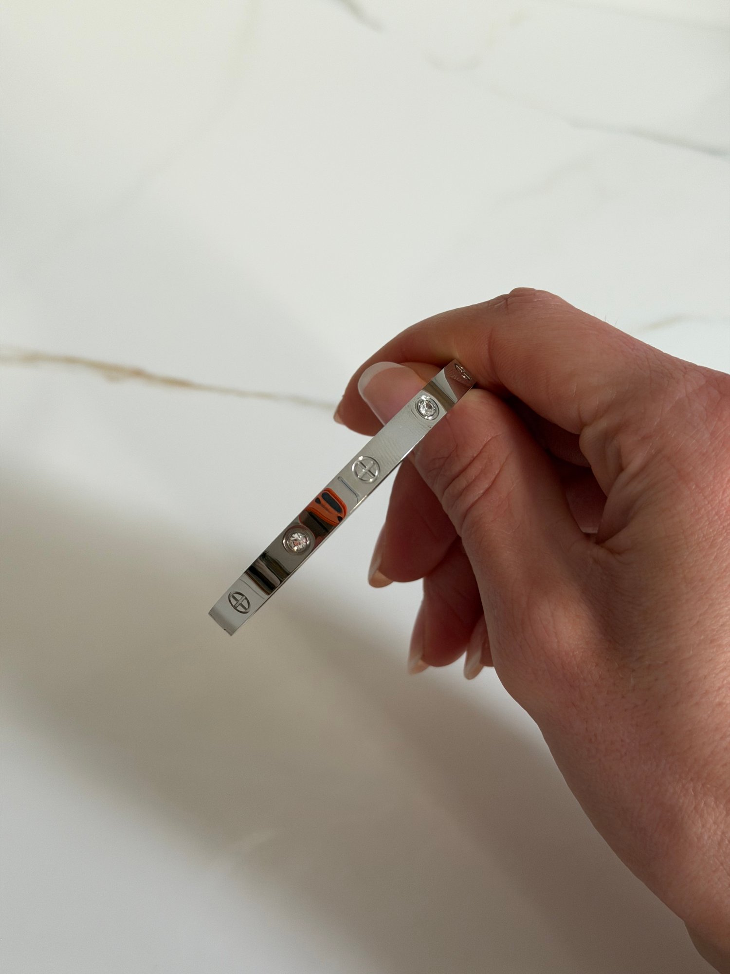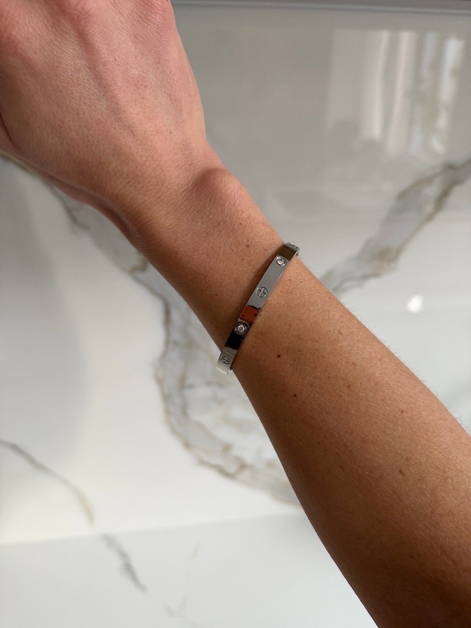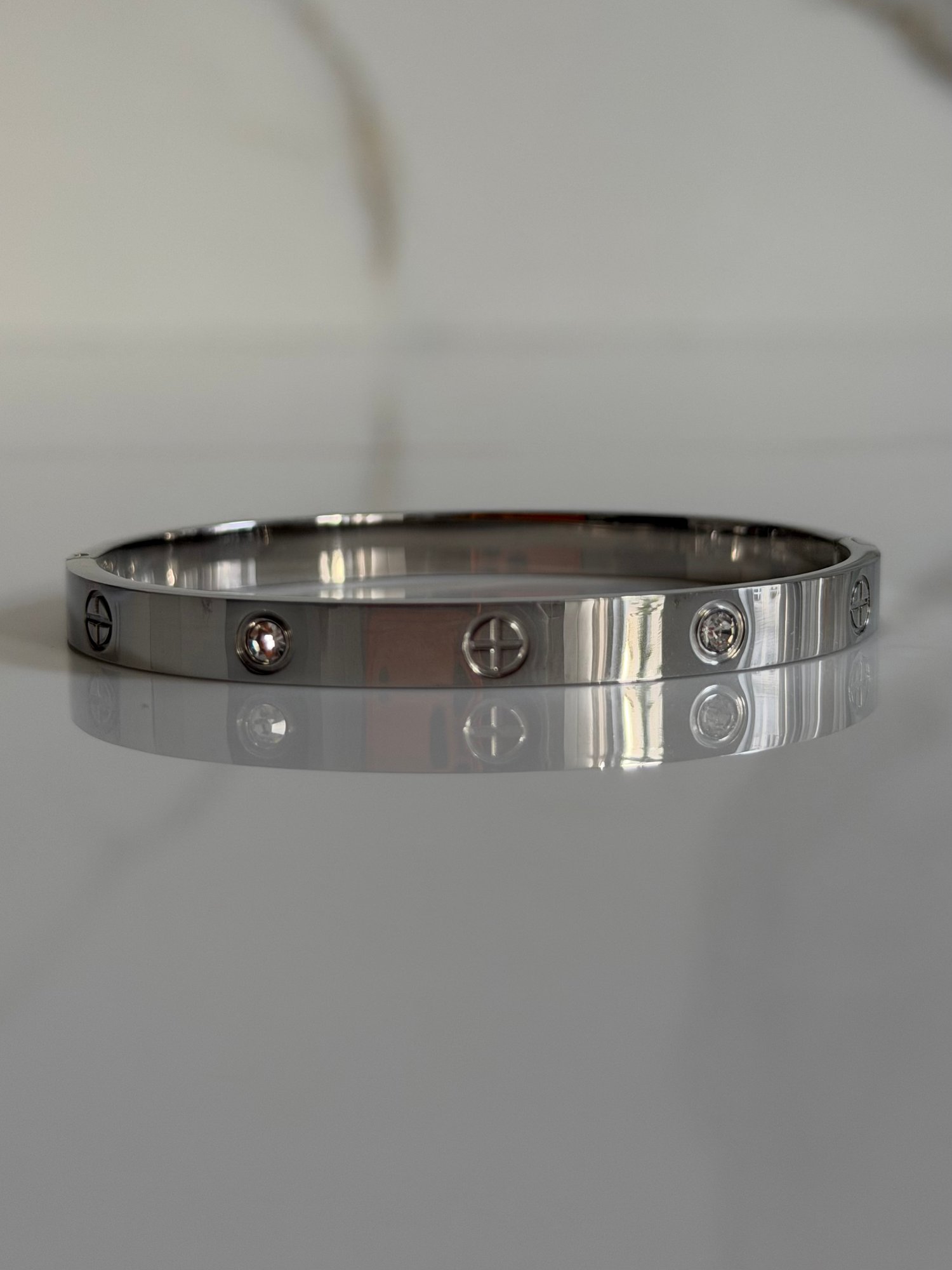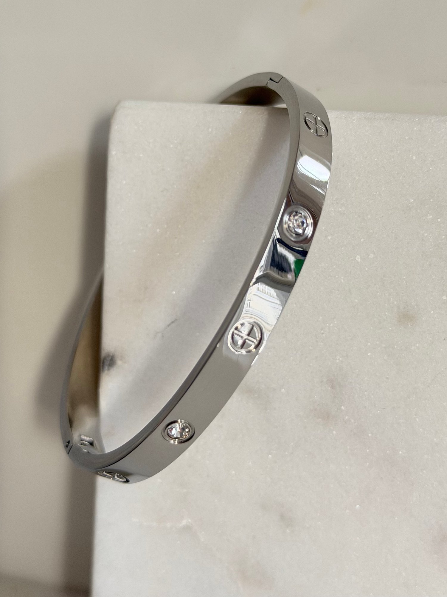 Un bracelet jonc argenté orné de gravures croisées et d’incrustations brillantes.
