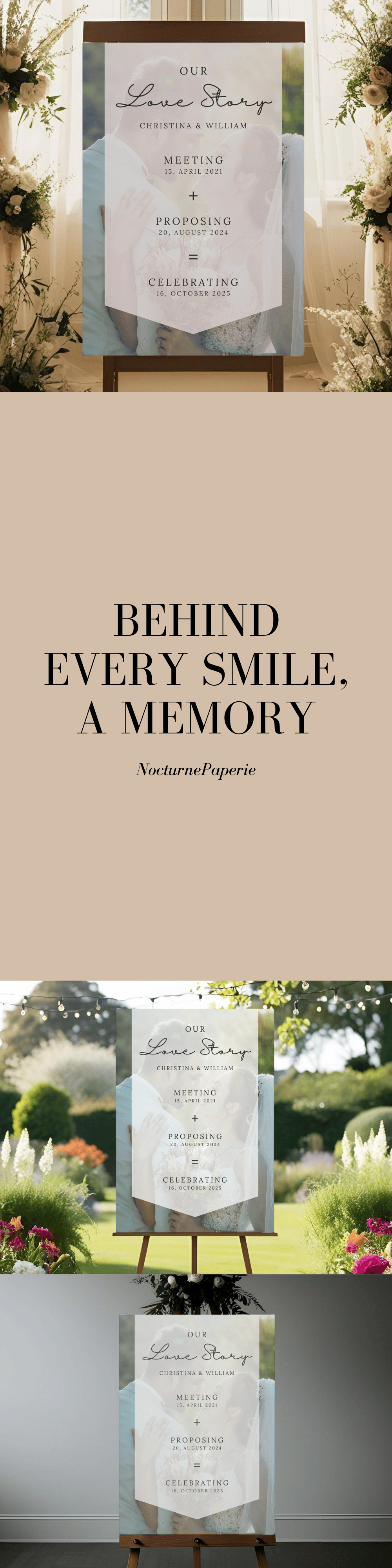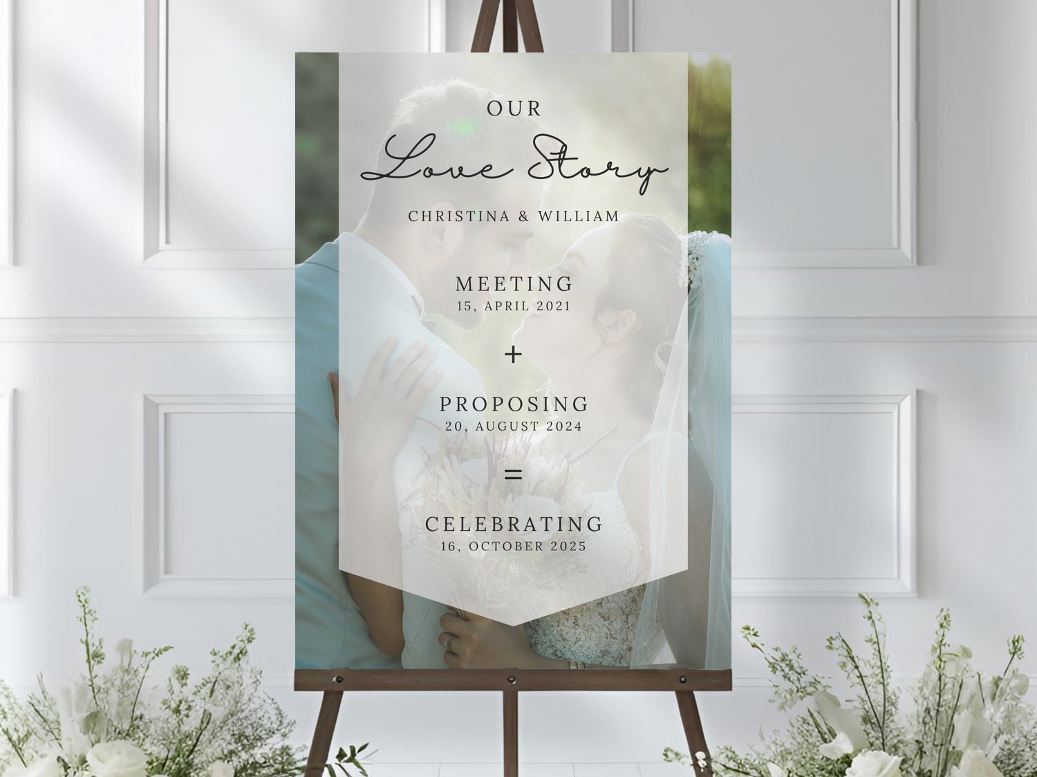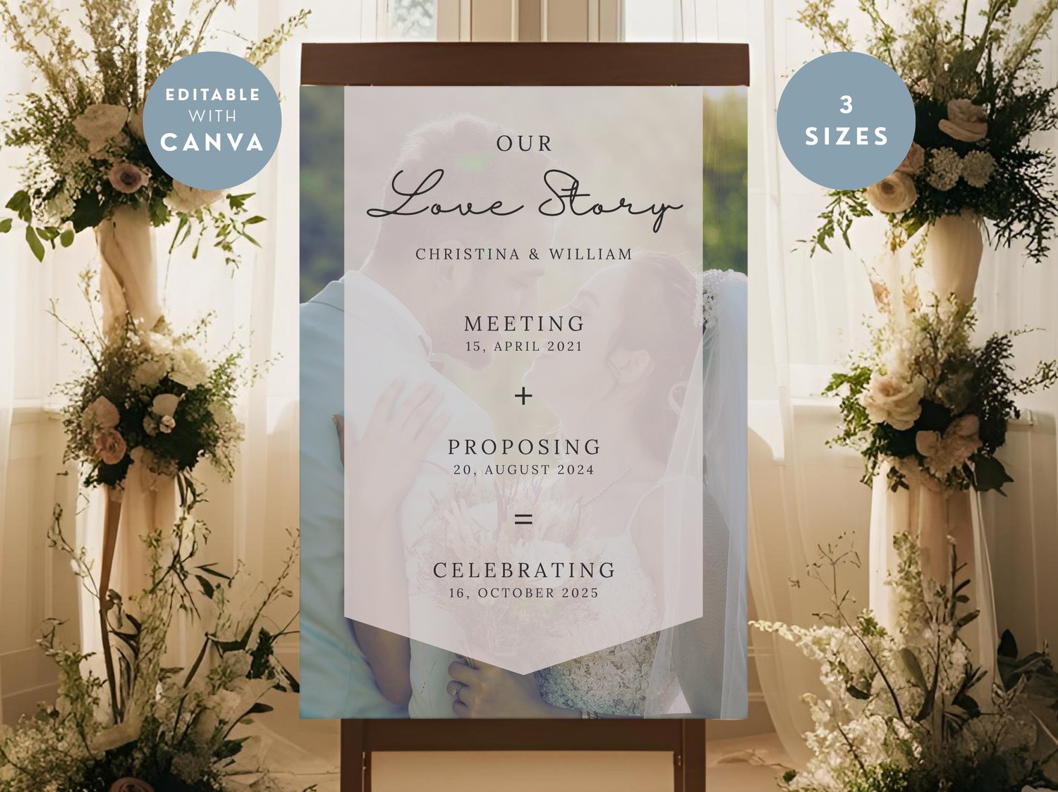 Share your memories with this love story timeline template featuring a full background photo. This editable Canva signage is perfect for telling your couple’s story and creating a romantic focal point in your wedding decor.
