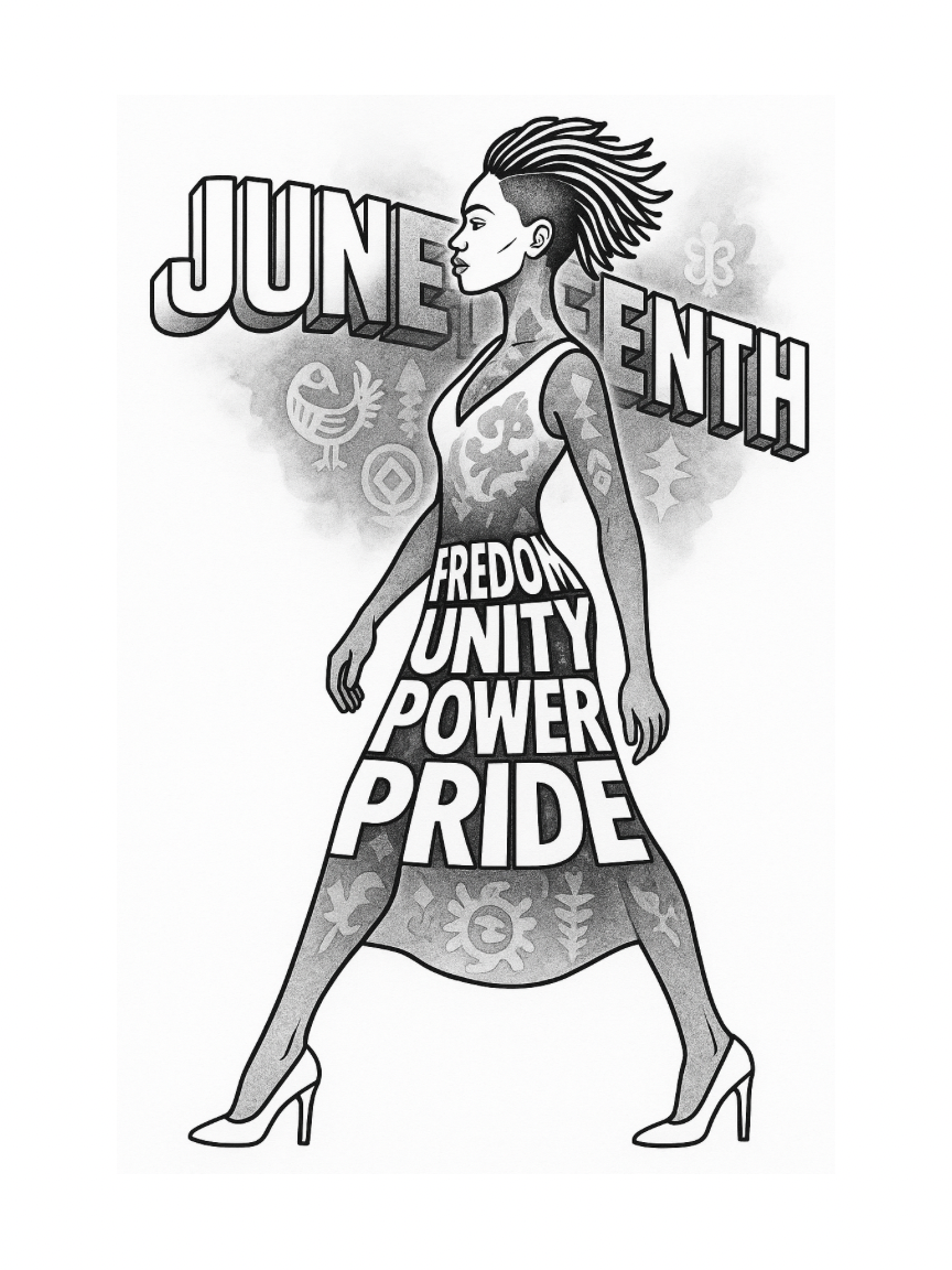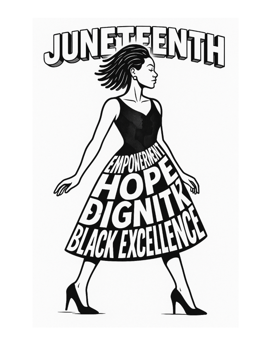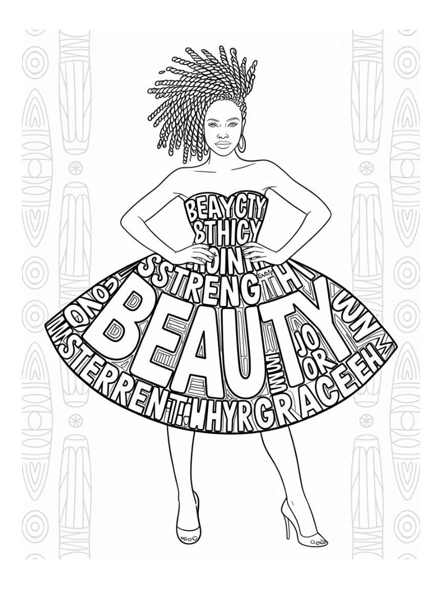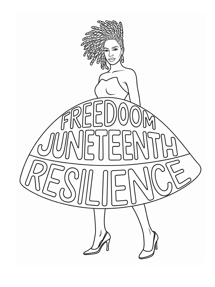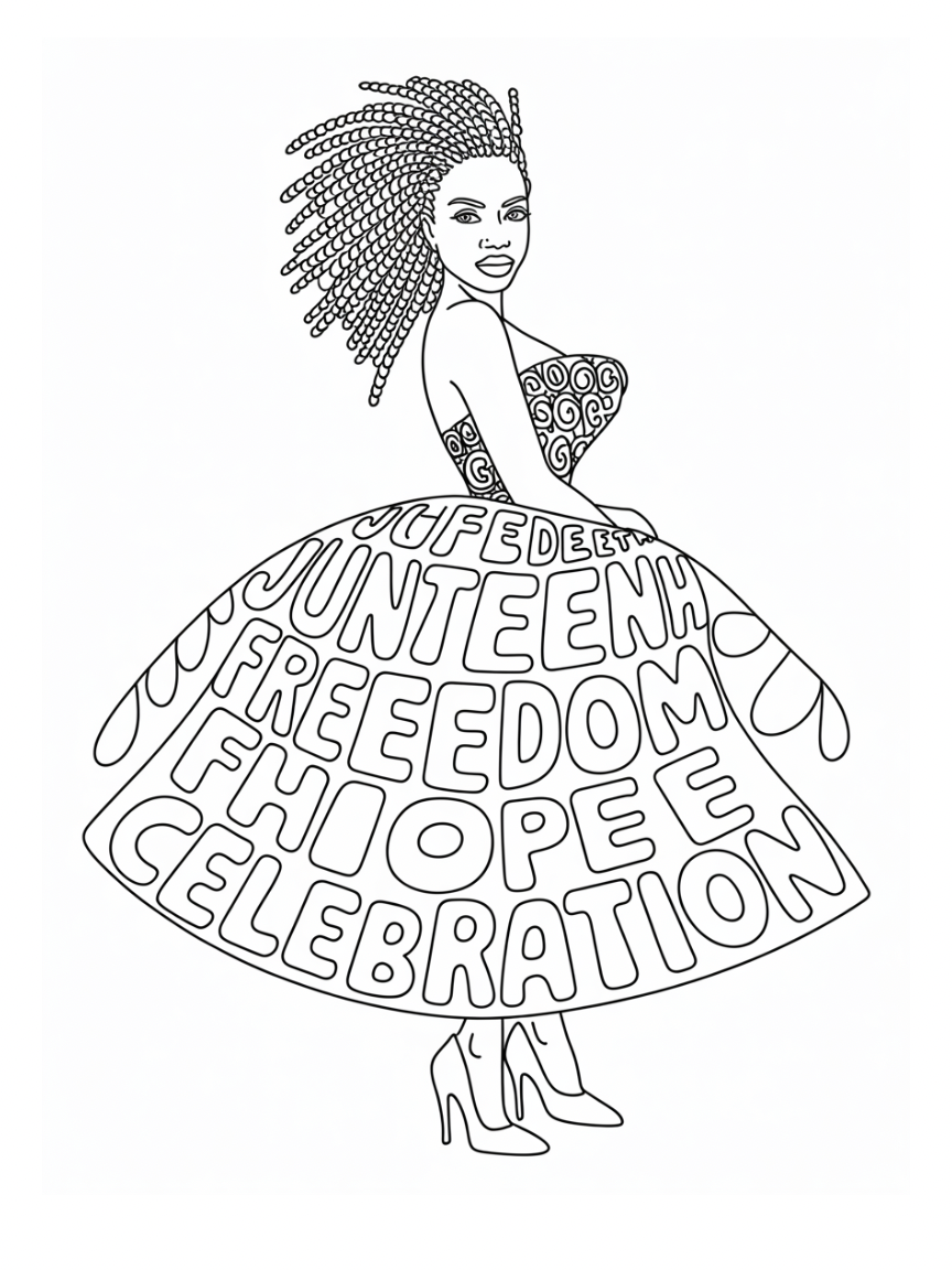 Celebrate Black beauty, history, and empowerment with this stunning 10-pack of high-resolution Juneteenth-themed coloring pages. Each page features a confident, stylish Afrocentric woman adorned in a powerful dress made entirely of bold, uplifting words like Juneteenth, Freedom, Love, Power, Unity, and Black Excellence. Designed with thick black outlines and clean silhouettes, these pages are perfect for easy coloring and ideal for both teens and adults.