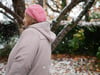 Pour information, je fais 58 cm de tour de tête et j’ai choisi la taille 55 cm, mon bord-côtes (en 2,5 mm) est étendu à son maximum quand je porte le bonnet. Ma fille a un tour de tête de 49 cm, je lui ai fait la taille 50, le bord-côtes ne serre pas (plus pratique en cas de couettes, chignons, barrettes et compagnie).