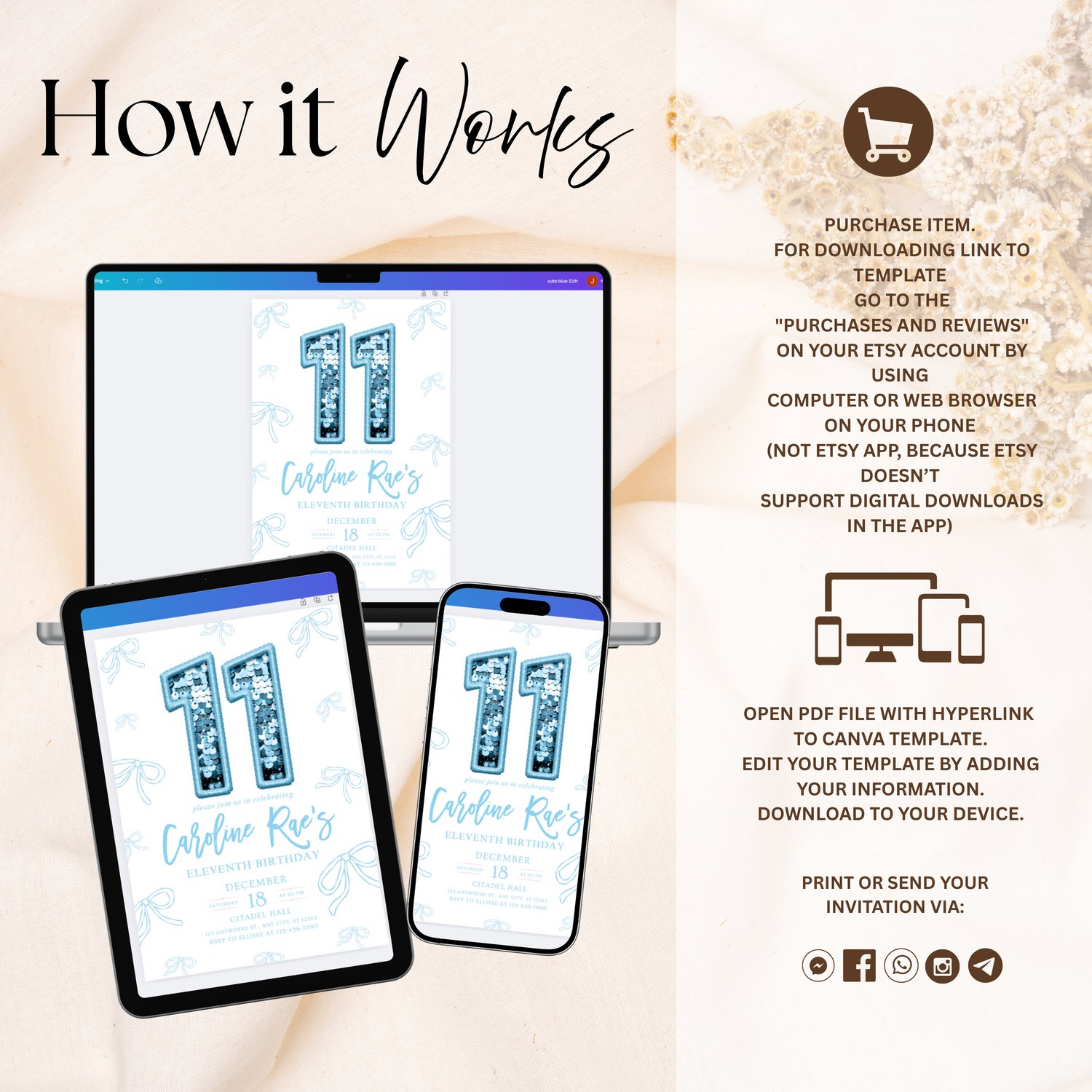 You can download the link upon purchase and we will send you the link to edit your invitation!