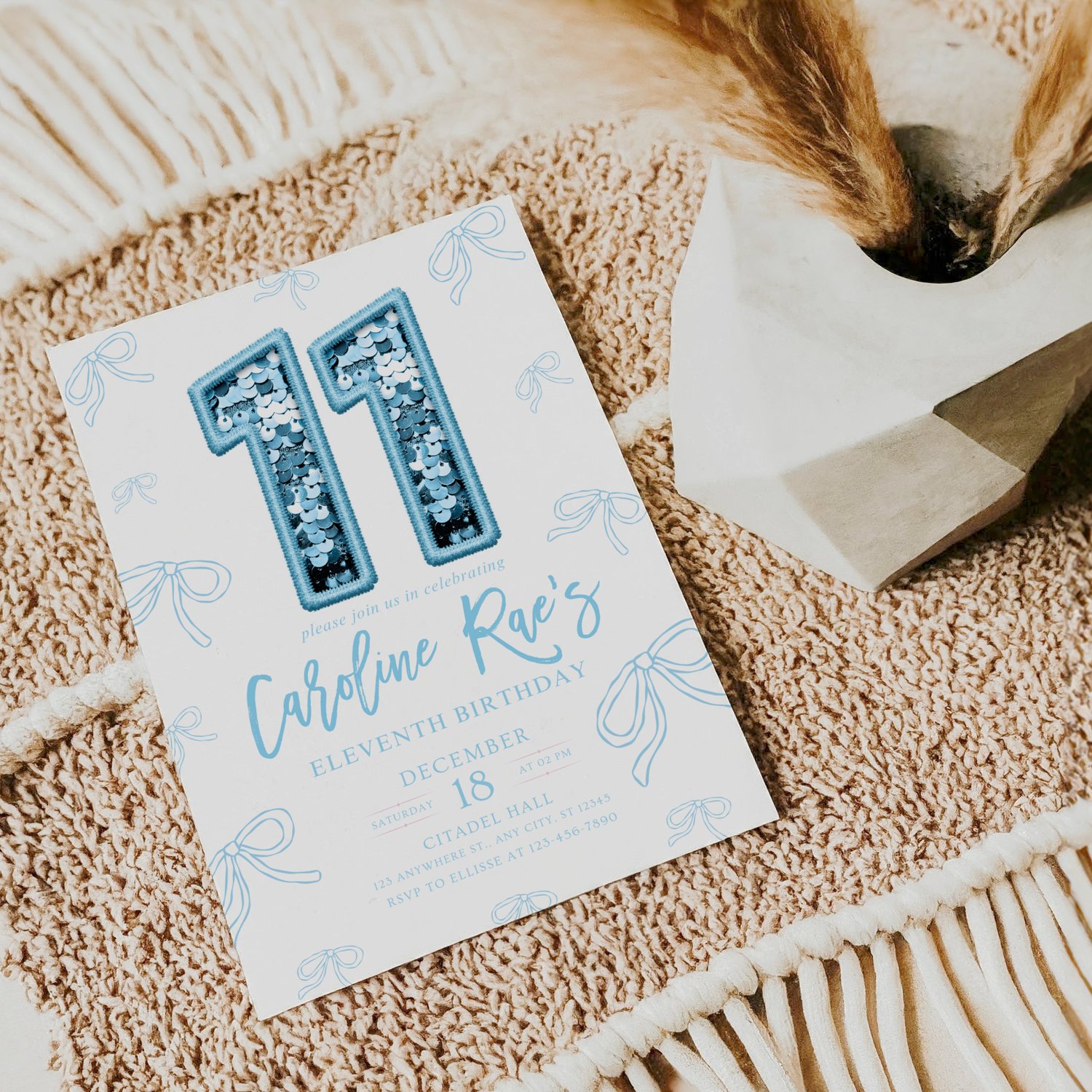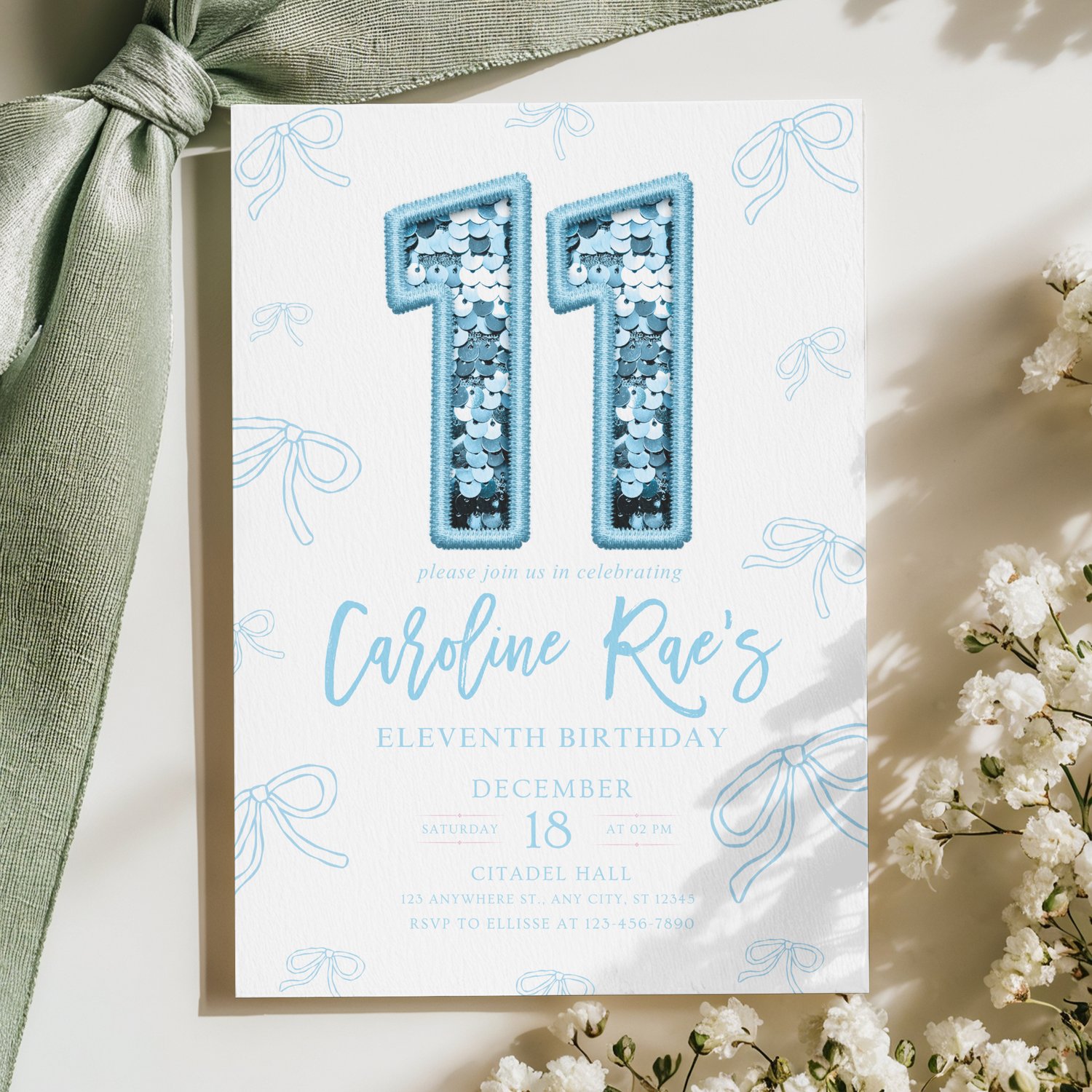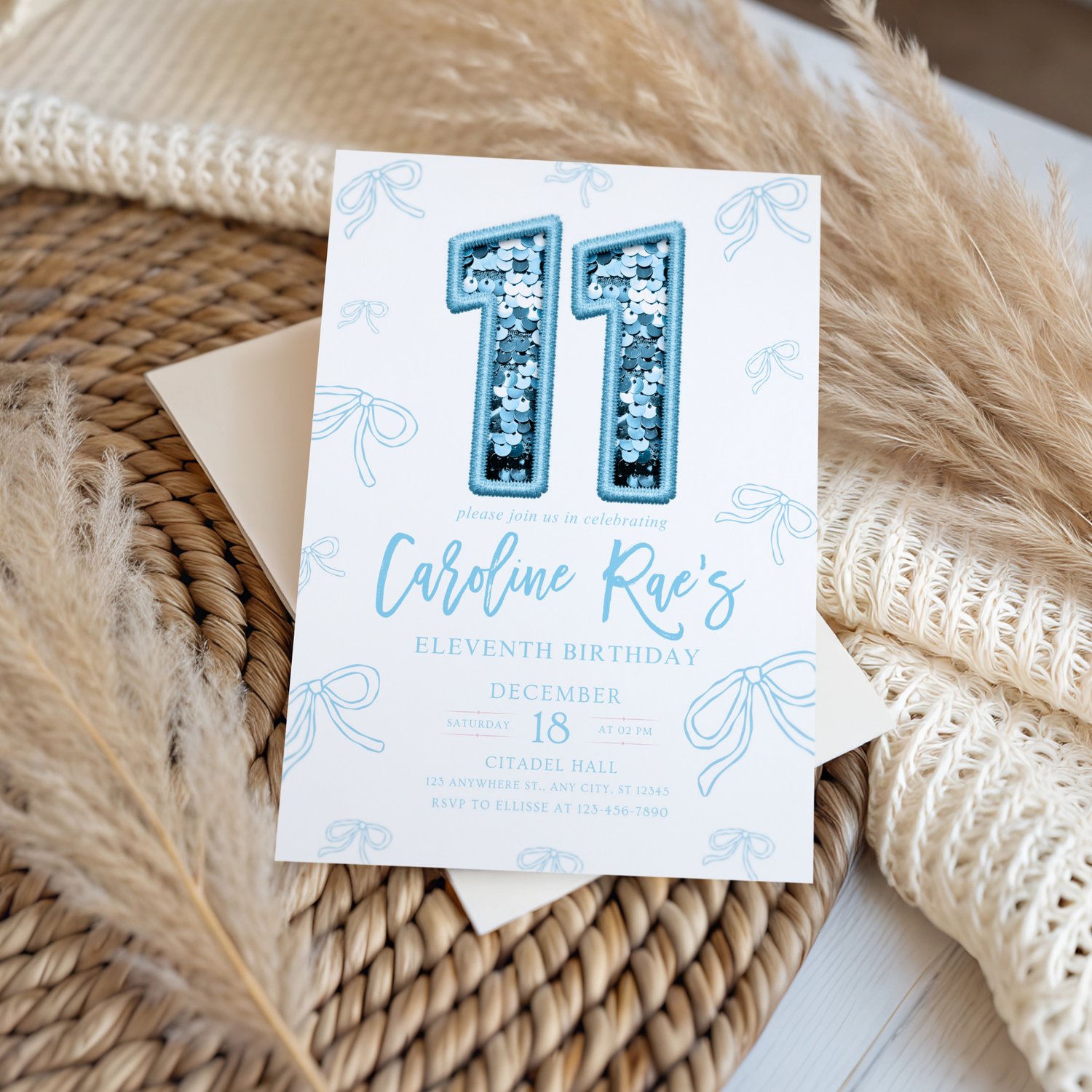 Editable Blue Bow Birthday Invitation, Blue Bow Girl Birthday Invite, Blue Girl Ribbon Minimalist Birthday Invitation Blue Coquette Invite
