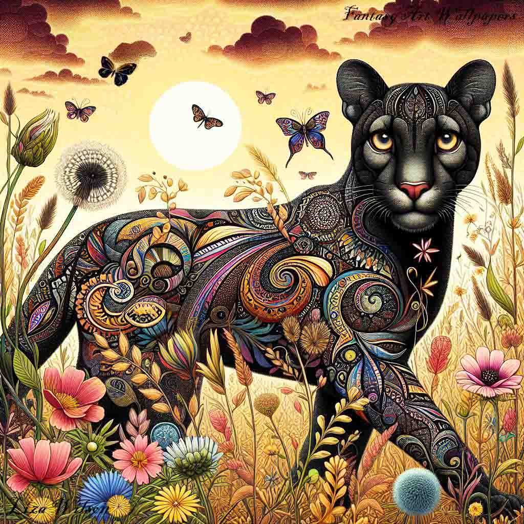 Patterned black Puma under a low setting sun & burgundy skies. There are colourful flowers & grasses.