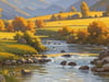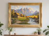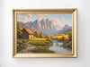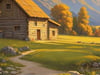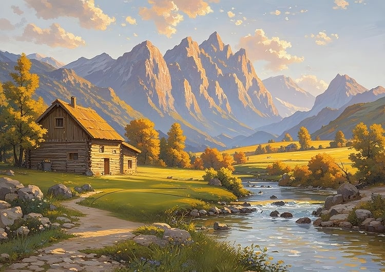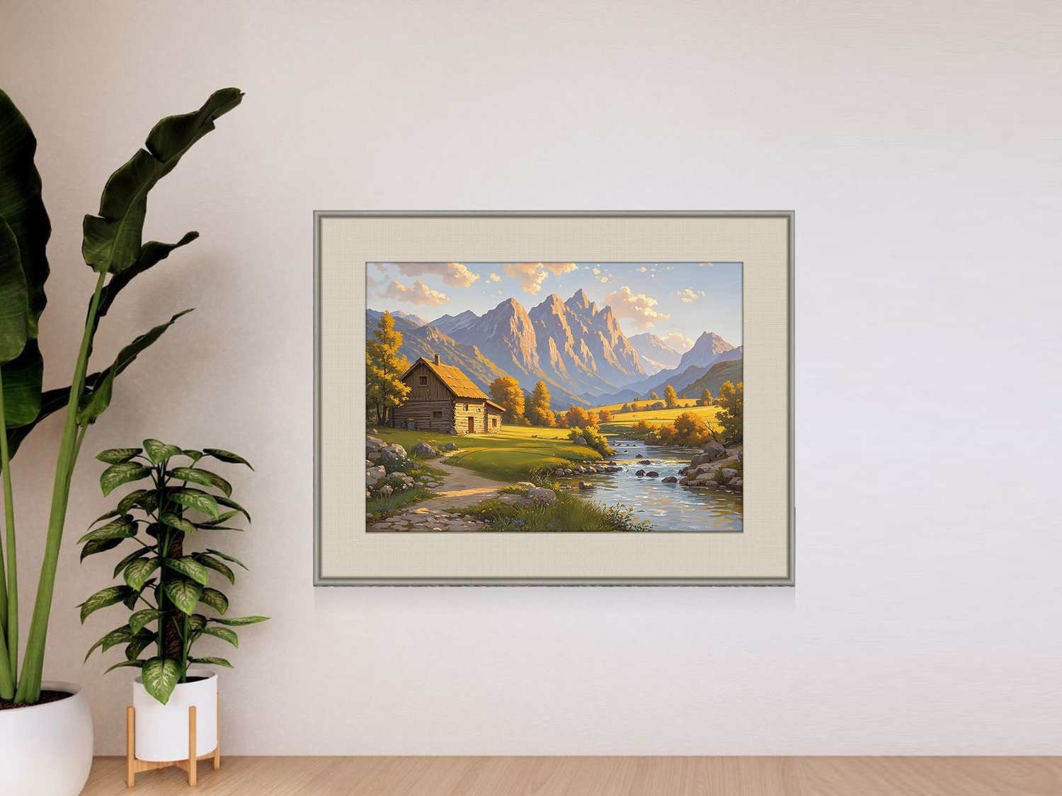 This artwork captures a serene and idyllic mountain landscape with remarkable harmony. The composition is well-balanced, with the wooden cabin on the left grounding the scene, while the flowing river leads the viewer’s eyes into the distance where majestic peaks rise dramatically against the sky. The warm golden tones of the sunlight create a sense of peace and timeless beauty, evoking both nostalgia and tranquility. The level of detail in the foliage, water reflections, and textures of the log cabin enhance the natural realism, while the slightly softened atmosphere gives the piece a painterly charm. Overall, it is a highly evocative artwork that combines realism with poetic warmth.