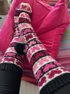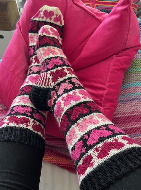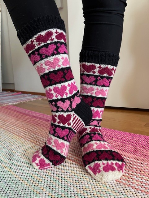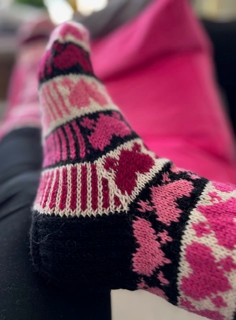 Heart-Shaped Soxx are knit top down, from cuff to toe. The socks with reinforced heel are worked in stockinette stitch and stranded colorwork.
