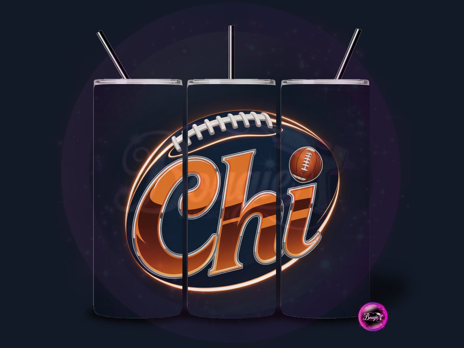 Show your city pride with this bold Chi Football Tumbler PNG, featuring an eye-catching orange and navy design shaped like a football with glowing accents. This 20oz sublimation wrap is perfect for personal tumbler projects, game-day cups, or gifts that celebrate your hometown hustle and team spirit.