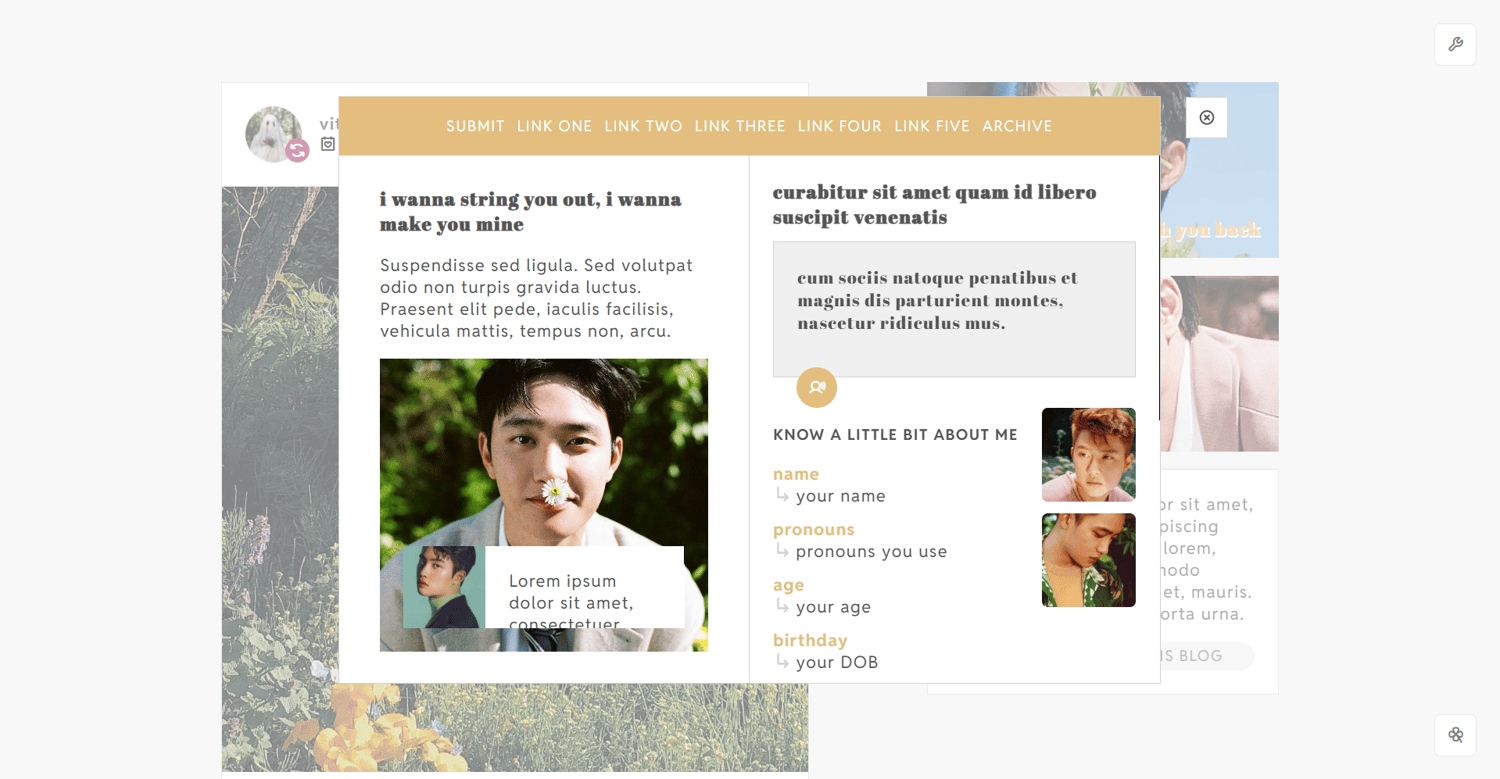 features: two 300x150px sidebar images, blog title, five custom links, 280x250x about image, 70x70px about icon image, text section, about quote section, about information section, two 80x80px abou information images, about content section, 450px to 540px text posts