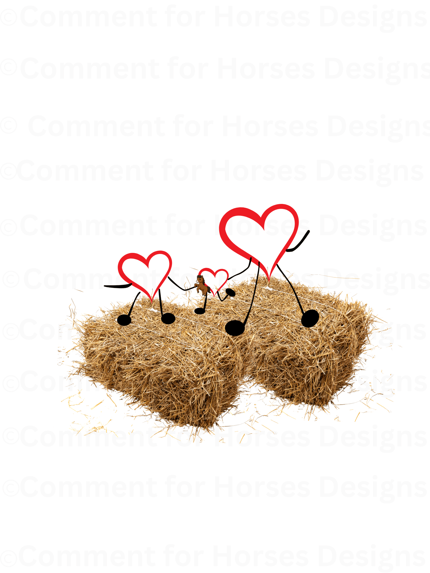 A heartwarming barn scene! This digital illustration captures a family of red heart stick figures, a big heart, a medium heart, and a small heart with a tiny horse all holding hands atop two hay bales. It’s a snapshot of the special bond shared in barn life, filled with love and togetherness. Perfect for horse lovers, families, or anyone who treasures the warmth of farm moments.