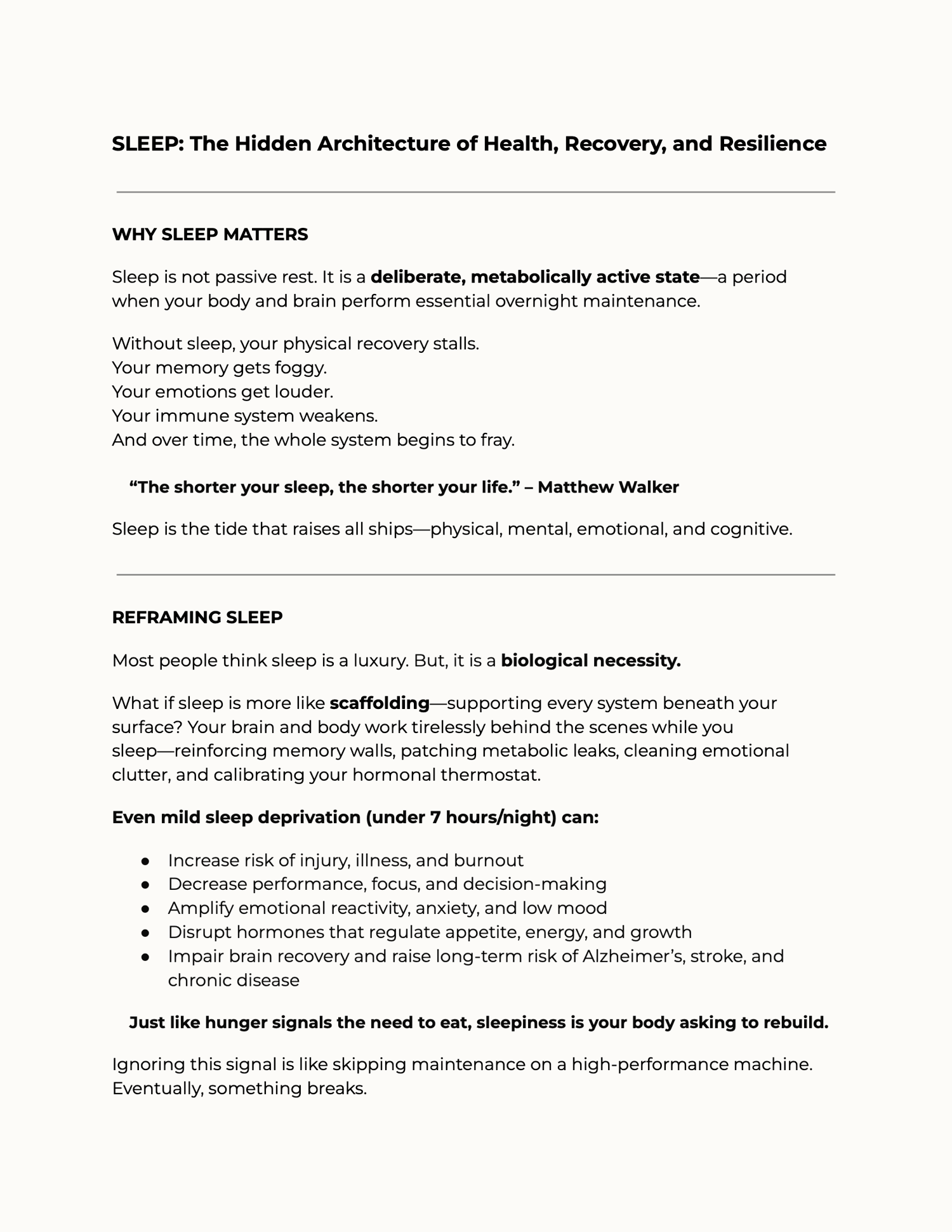 This isn’t about sleep “hacks.” It’s about understanding your biology so you can work with it—not against it. Whether you’re healing from burnout, supporting concussion recovery, training for performance, or just trying to feel more human again—this guide meets you at the root cause.