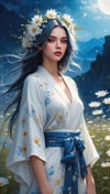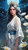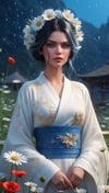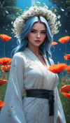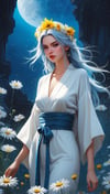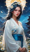 An elegant depiction of an anime woman gracefully dressed in a flowing white kimono, exuding purity and sophistication. The intricate details of the garment and serene atmosphere create a timeless and captivating artwork, perfect for lovers of anime, Japanese culture, and artistic illustrations.