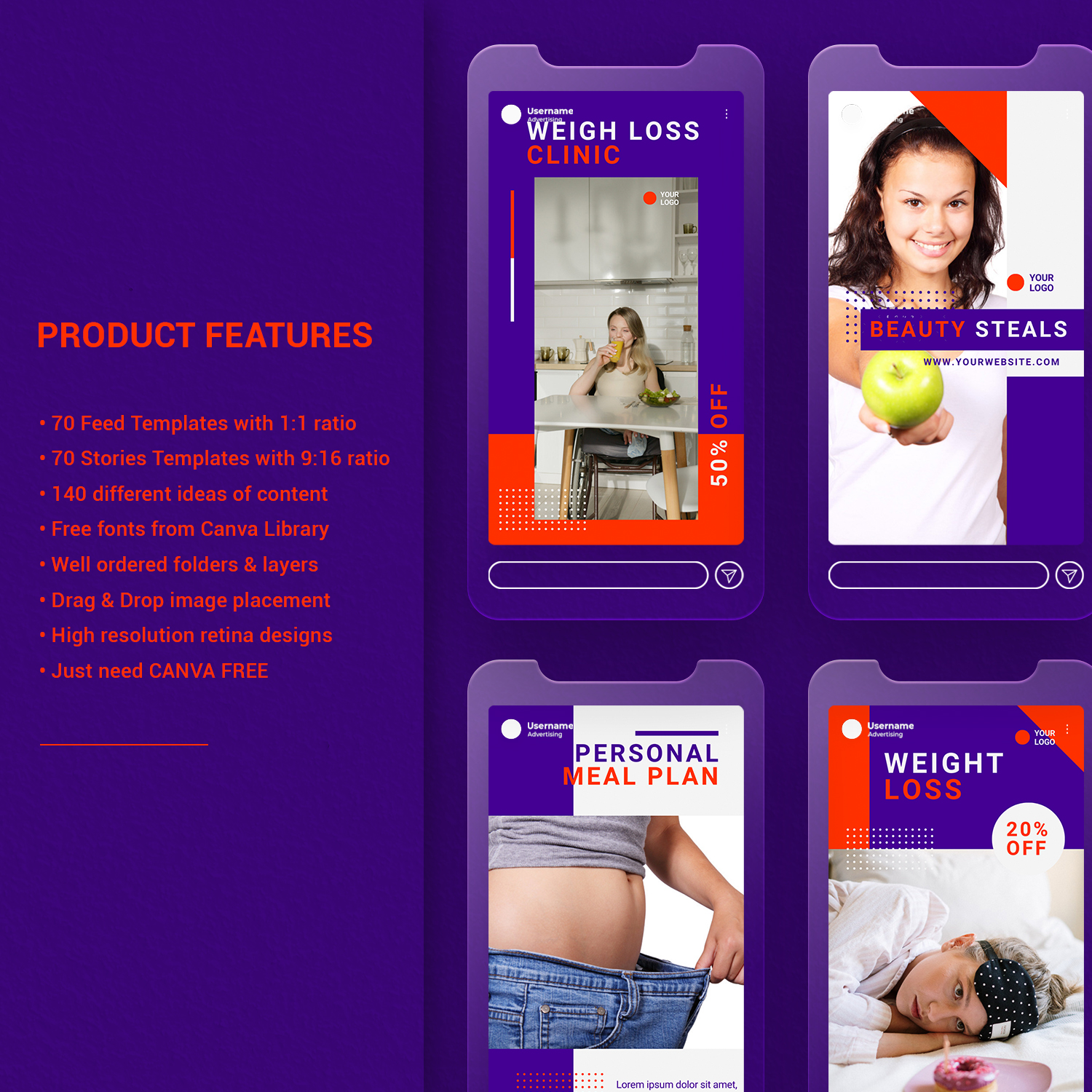 - 70 Story Post Templates: Showcase transformations, health routines, upcoming launches, and quick wellness insights with captivating story templates.