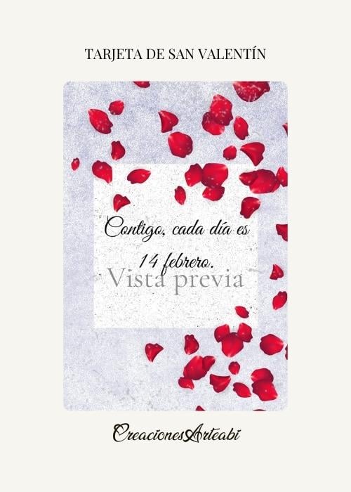 Una tarjeta con estilo vintage y textura brillante, decorada con pĂ©talos de rosa sobre un fondo plateado que aporta elegancia y romanticismo. El mensaje central, “Contigo, cada dĂa es 14 febrero.”, expresa un amor constante, que no depende de fechas para sentirse especial.