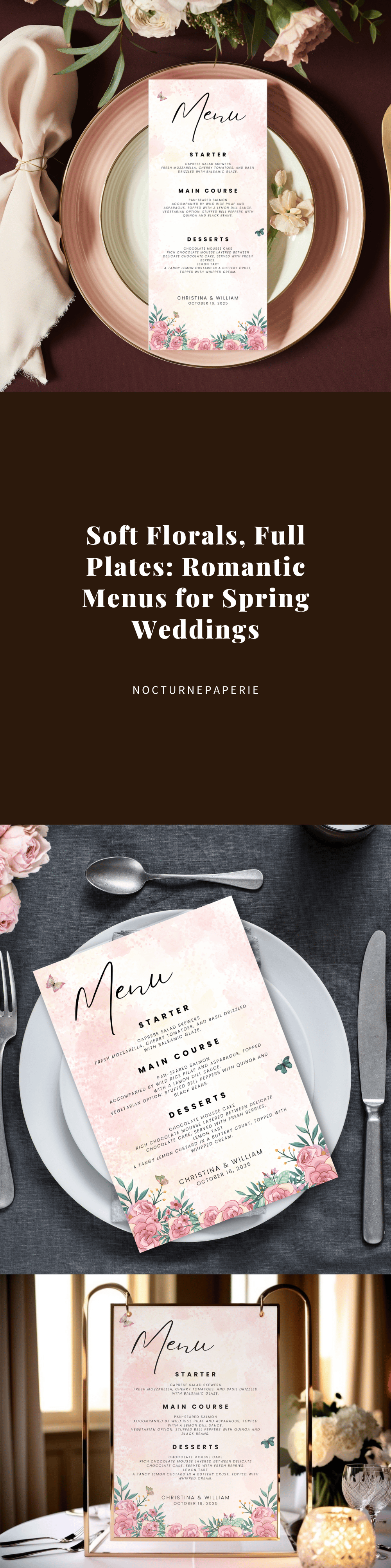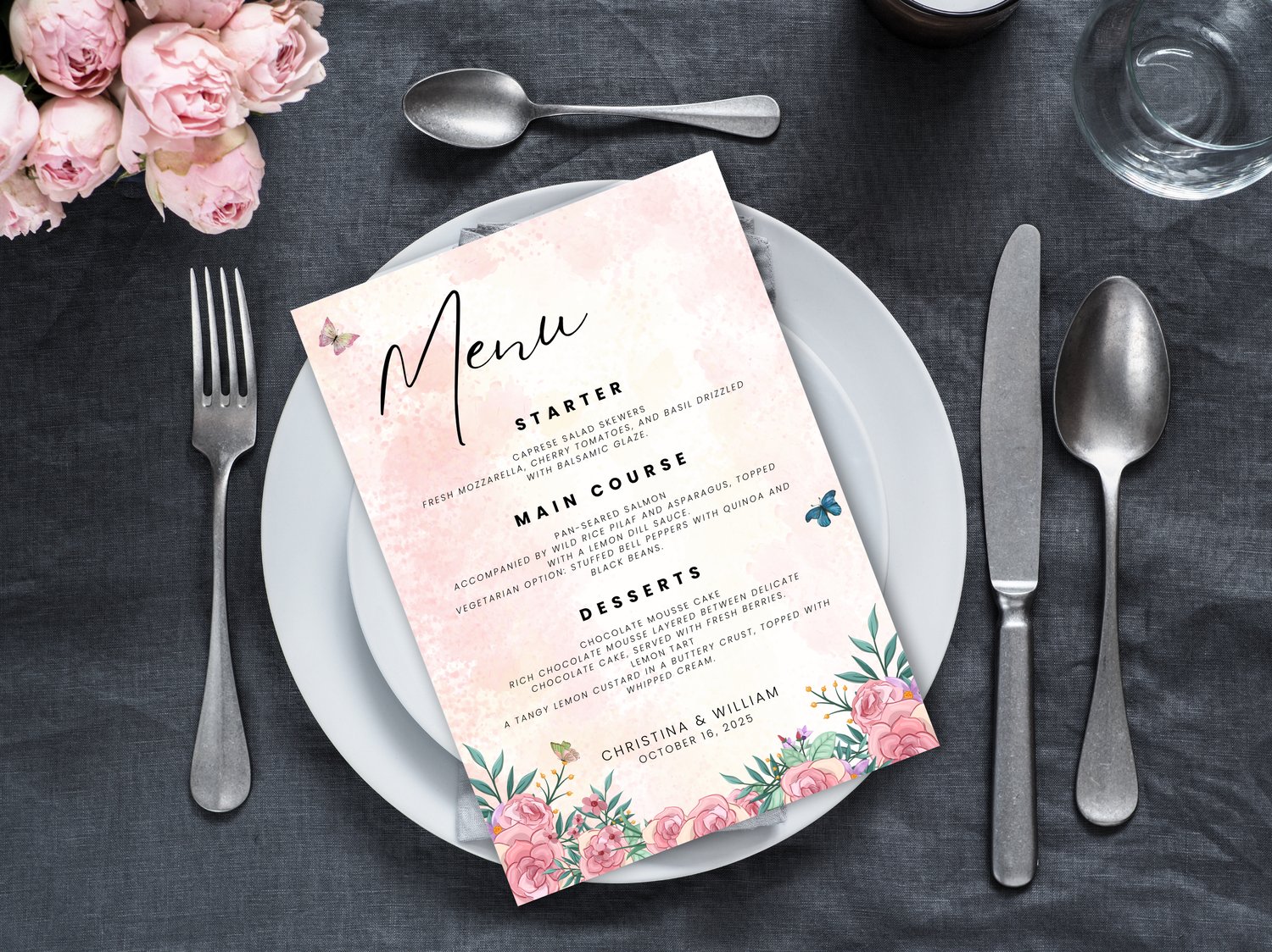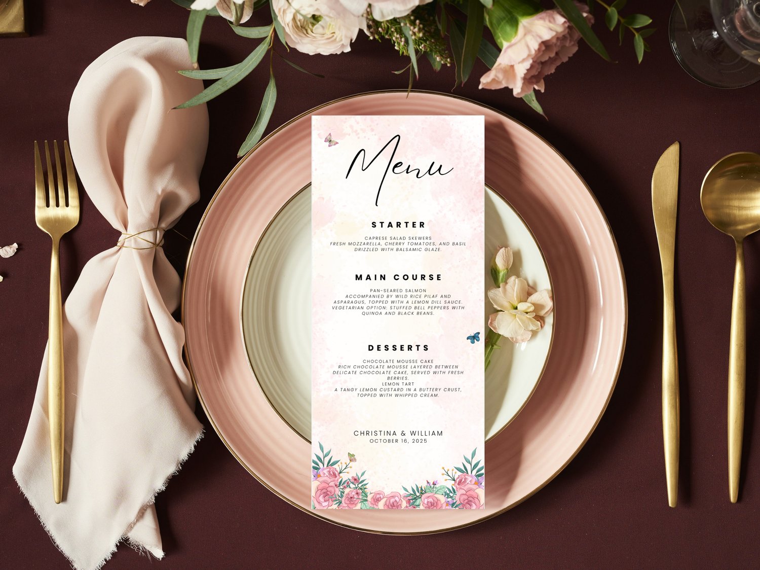 Bring a touch of romance to your table with this rose wedding menu template featuring a pink floral design. This editable printable is perfect for spring wedding dinners, bridal showers, or reception meal displays. It’s part of our Spring seasonal collection on NocturnePaperie—explore other seasons like Winter, Summer, and Autumn.