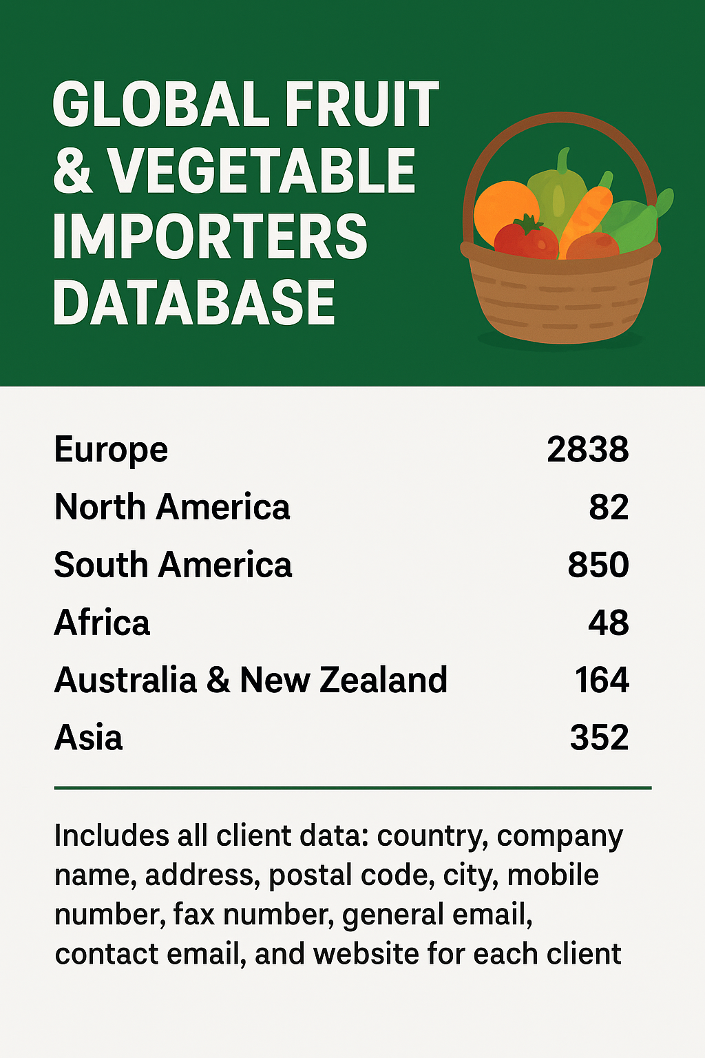 A comprehensive and up-to-date database of global fruit & vegetable importers, professionally organized and ready for exporters looking to expand their business and reach new clients efficiently.