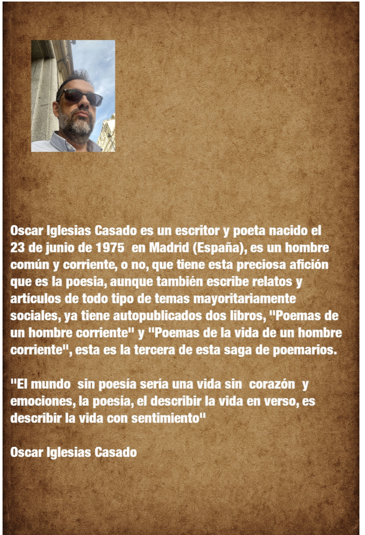Quería desde esta plataforma presentarles mi último libro de poesías llamado "Poemas de un hombre (poco) corriente" es un poemario que escribí desde el corazón, para dar a conocer mi humilde hombre y que ofrezco a todos ustedes por un precio sumamente bajito, popular, 4,5 euros, espero os guste, os mando un abrazo grande.
