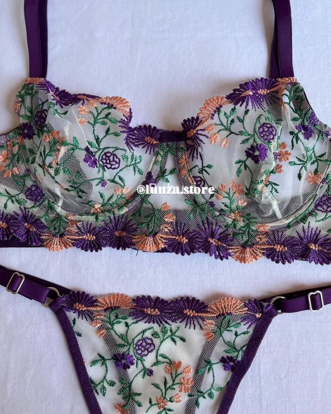Purple Women's Floral Underwire Lace Bralet Dowry Wear Bra Panties Underwear Set
