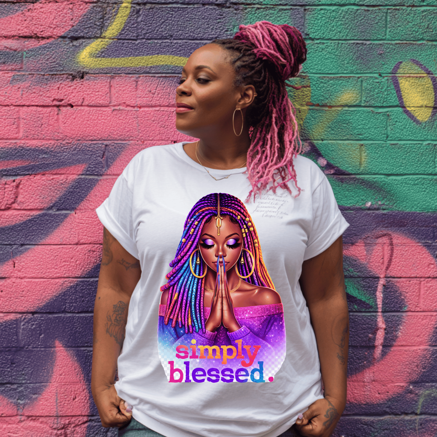 This Simply Blessed digital artwork features a beautifully illustrated Black woman in prayer, adorned with vibrant multicolor braids and golden accents that symbolize divine favor, spiritual protection, and inner peace.