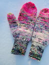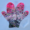 I used about 60-70m per color. They are about 7.5 inches long (palm to tip, excluding ribbing) and 7.5-8 inches around.