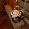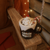 Just a mug of hot coco, whipped topping, with tiny marshmallows and sprinkles, cherry on top, and 2 candy canes on the side!