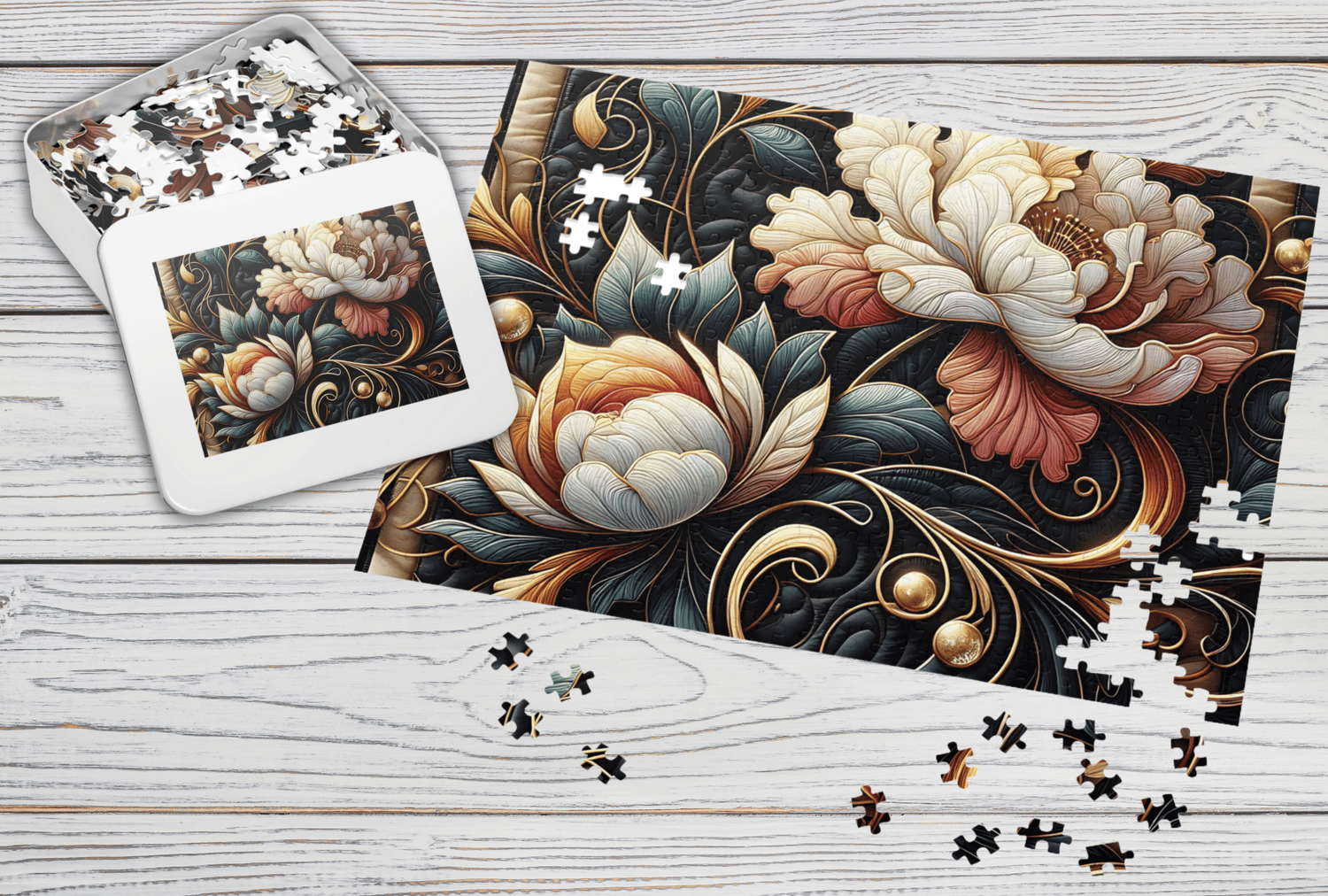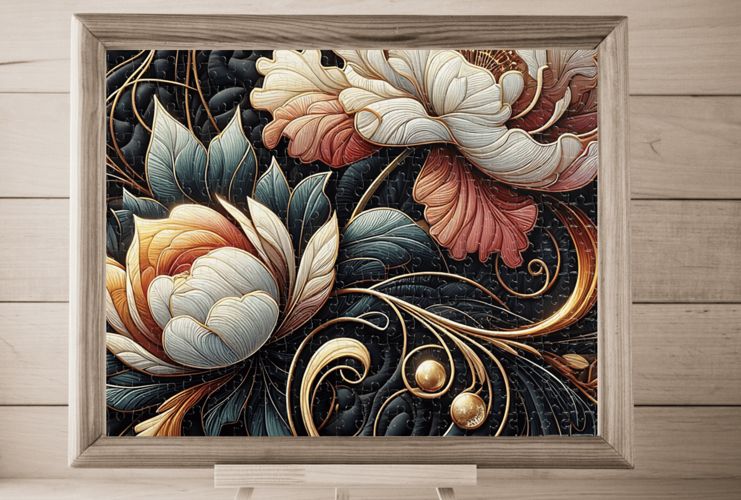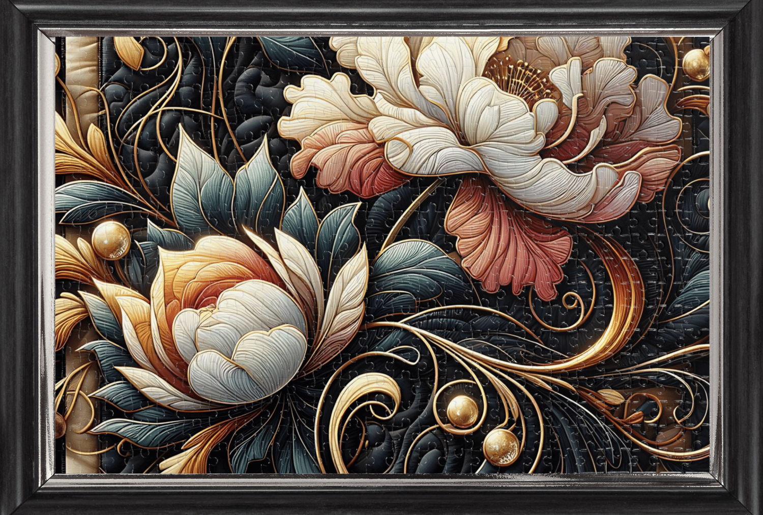 Introducing "Botanical Elegance The Baroque Blossom Collection Puzzle," a sumptuous visual symphony that beckons you to the golden age of art with a contemporary twist. This puzzle, available in both 1000-piece and 500-piece editions, presents a lavish exploration of baroque beauty through grand florals and curvaceous foliage accented with pearl-like orbs and gold filigree. Each puzzle piece is designed to challenge and captivate, as you weave together the creamy petals and verdant leaves that epitomize the period's love for detailed opulence. Whether you seek the satisfaction of the full 1000-piece complexity or the gratifying completion of the 500-piece variant, this puzzle is a tribute to the enduring allure of botanical art, providing hours of tranquil yet stimulating entertainment. Upon completion, "Botanical Elegance" becomes a magnificent work of art that is as rewarding to gaze upon as it was to compose.