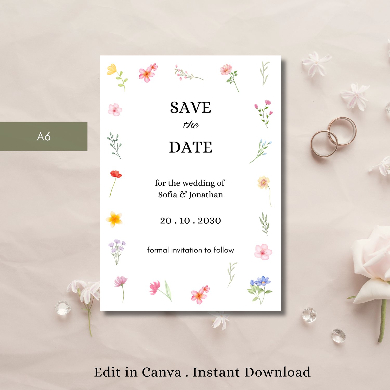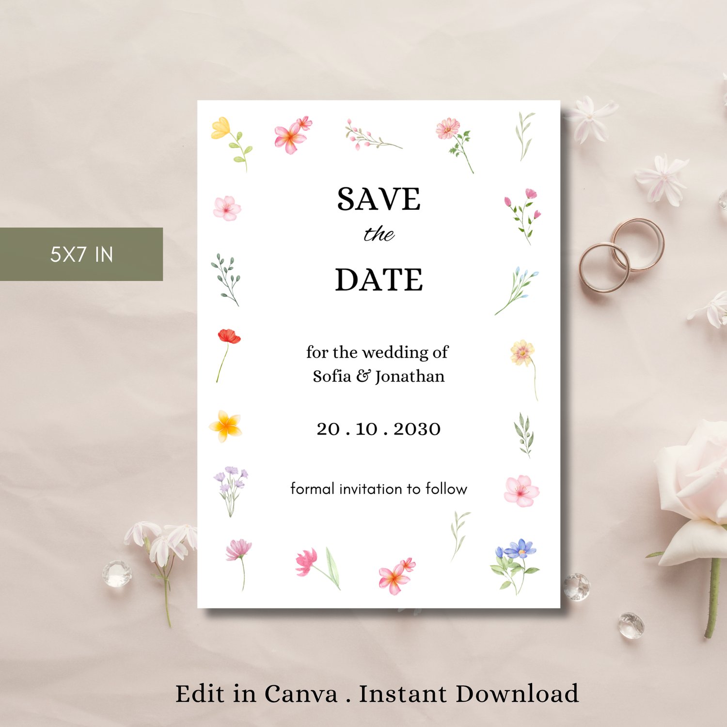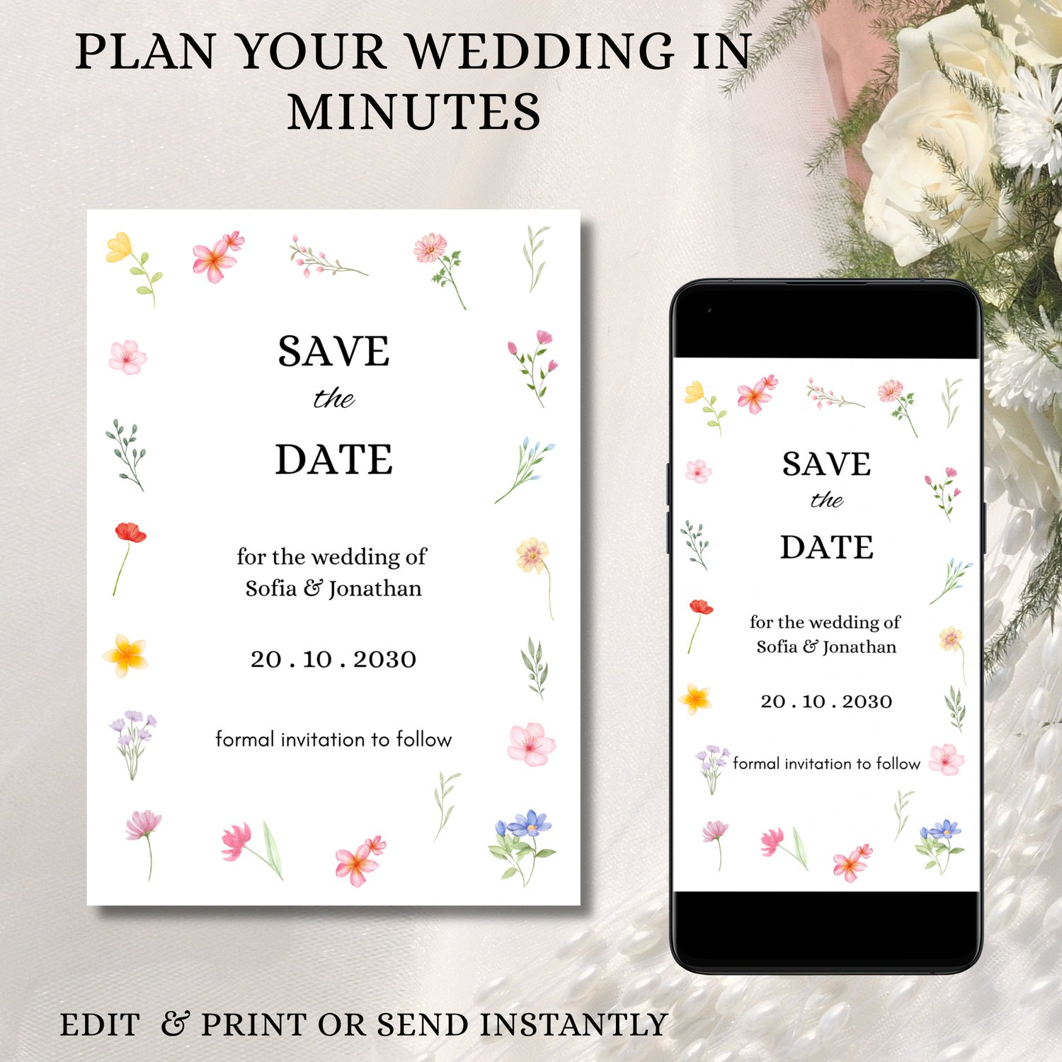 Wildflower Wedding Save the Date, Editable Botanical Floral Announcement Card template | Romantic Spring Invitation | Printable & Digital Canva Invite