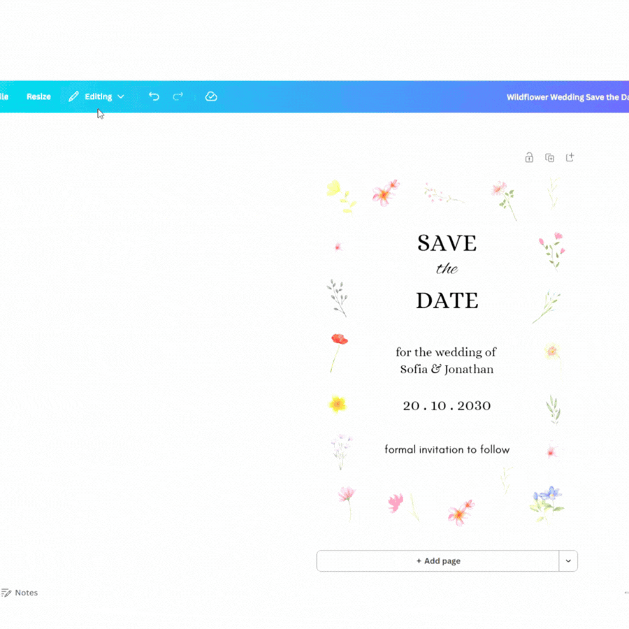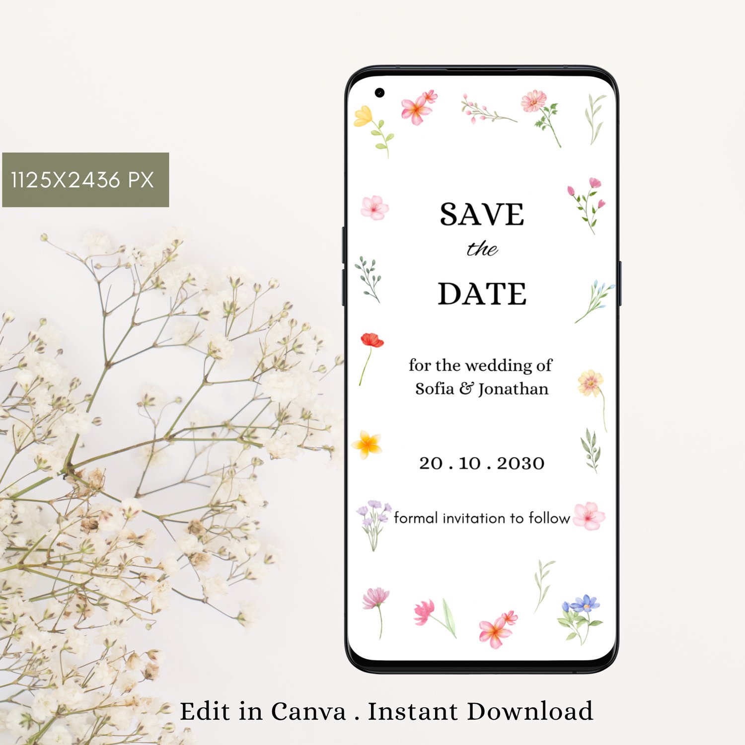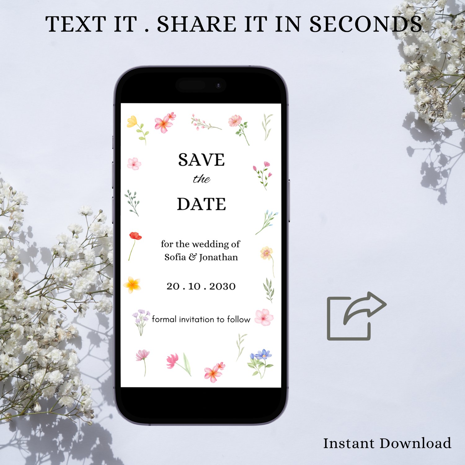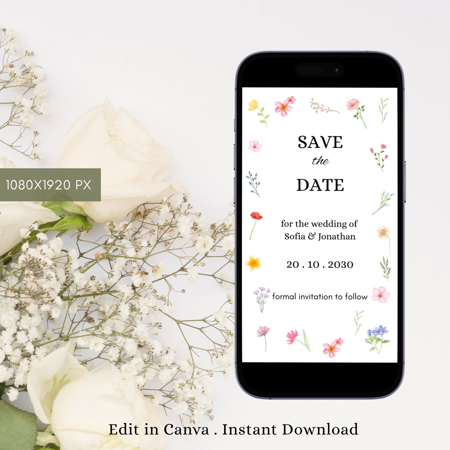 Wildflower Wedding Save the Date, Editable Botanical Floral Announcement Card template | Romantic Spring Invitation | Printable & Digital Canva Invite