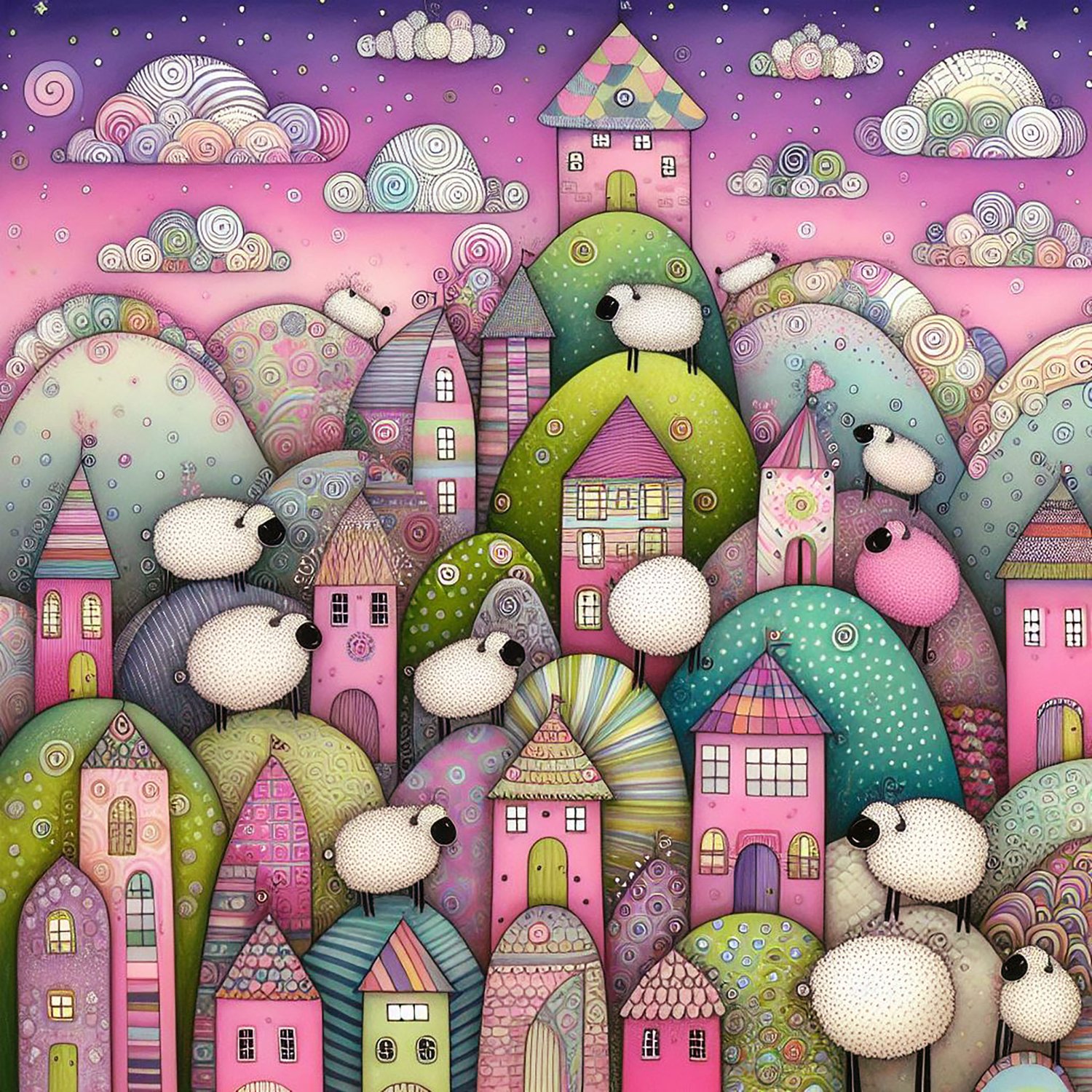Whimsical Worlds of Houses & Trees, cute clouds, high hills, curly sheep.
