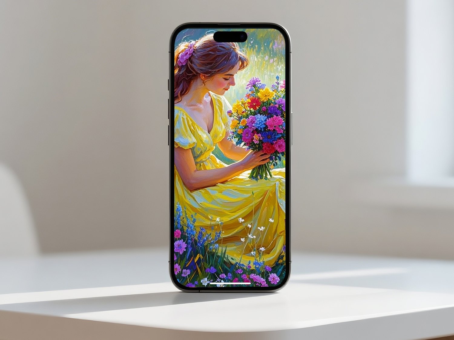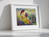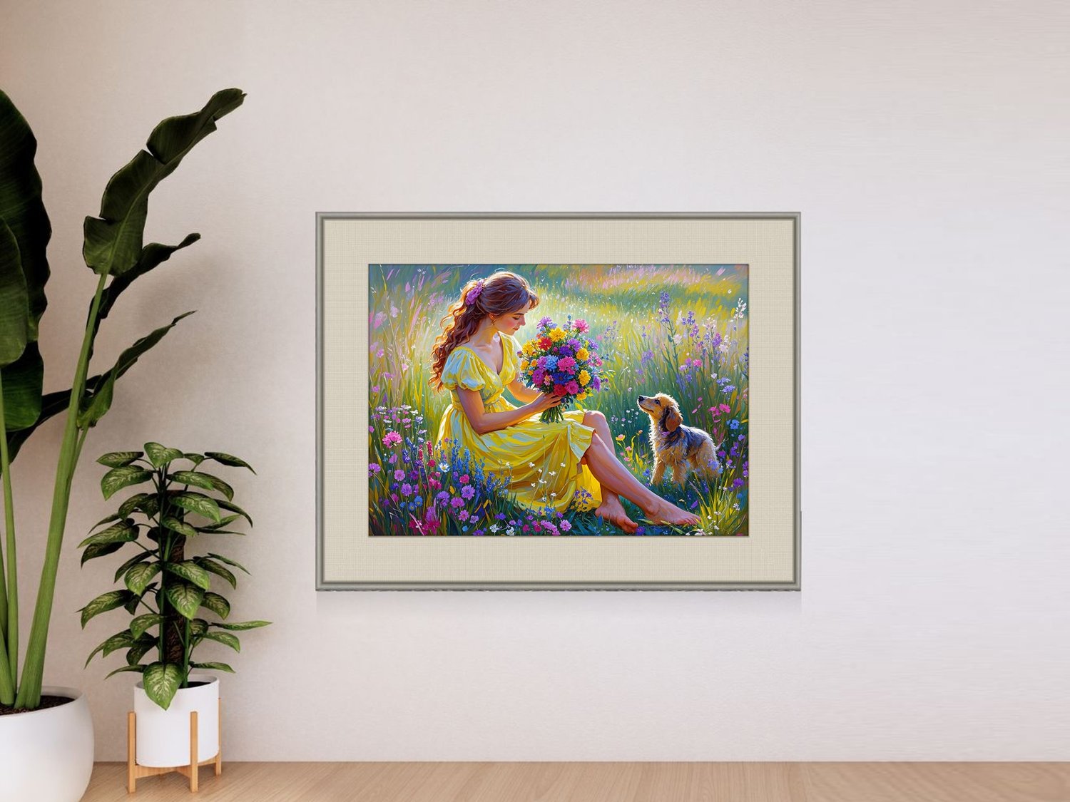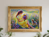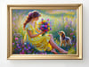 This digital artwork captures a tender moment between a girl and her puppy surrounded by wildflowers under the warm sunlight. With its soothing colors and poetic composition, it’s perfect for bedrooms, living rooms, or wellness spaces.