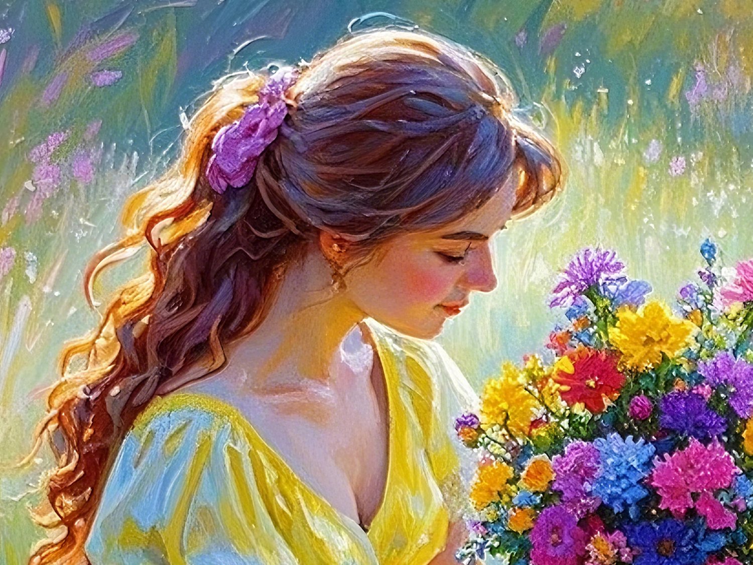 Girl and Puppy in a Field of Flowers | Romantic Digital Art for Peace and Joy uk016