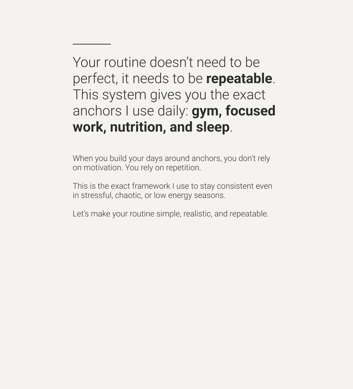 - Clear daily anchors (gym, focus, nutrition, sleep)