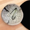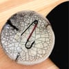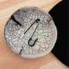 Estes alfinetes são a reinterpretação desses tradicionais alfinetes de gancho. Aqui apresentados com uma corrente de crochet feita com fio de metal colorido sob um alfinete preto.