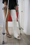 Next, we accompany Flora, who has now changed from her white shorts into a very, very short black dress that reveals the entirety of her long legs and the cast. The technician has applied a very high cast, almost reaching her groin. The cast is not yet fully dry, so Flora has to walk with great difficulty using crutches, without putting any weight on the plastered leg.