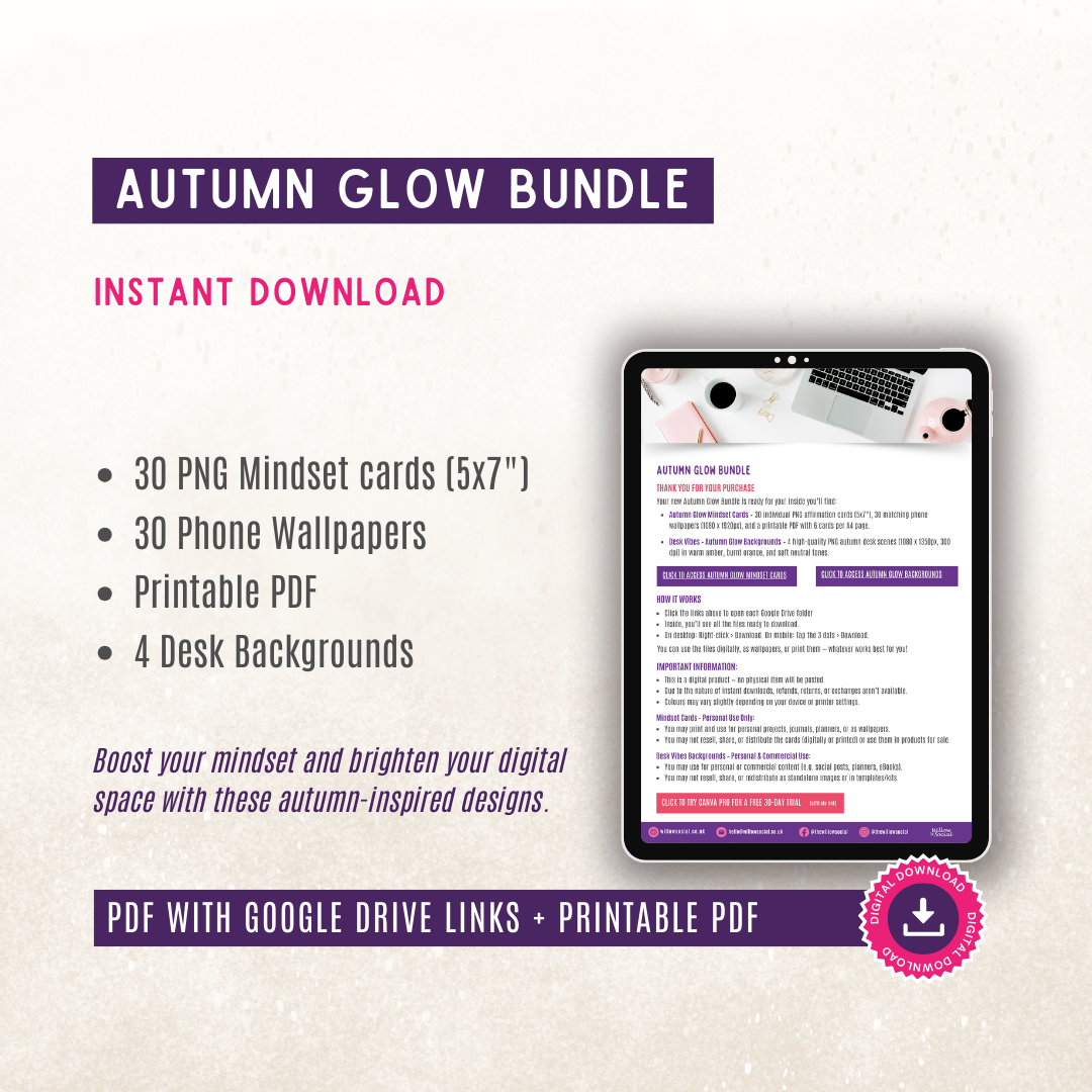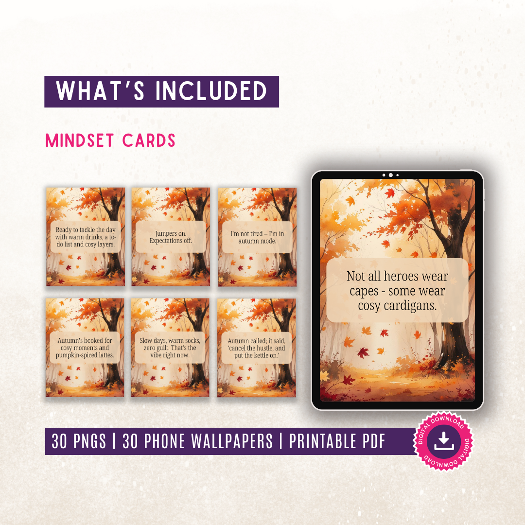 Bring the cosy warmth of autumn into your day with this uplifting digital bundle, designed to boost your mindset and refresh your digital space. Perfect for social media backgrounds, planners, lock screens, or simply surrounding yourself with seasonal inspiration.